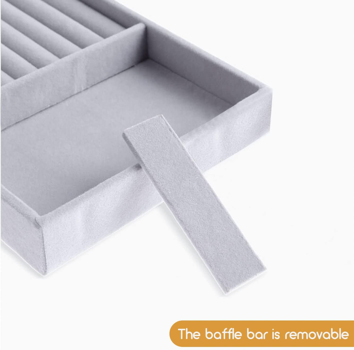 ➤El paquete incluye: Organizador de bandejas para joyas de 4 piezasBandejas para joyas en terciopelo gris suave al tacto, tacto suave y aspecto elegante. Esta bandeja para joyas protege sus joyas de daños y rasguñosEl diseño único le permite ajustar el tamaño y la cantidad de compartimentos en la bandeja para joyas para satisfacer sus necesidades de almacenamiento individuales.</ p>Elegante diseño apilable para combinar con cualquier lugar como salón, tocador, tienda y mesa de maquillaje. Mantiene sus joyas dispersas organizadas para crear una apariencia ordenadaEl material gris muestra perfectamente todo, desde retes y anillos hasta colgantes y broches, evita que sus joyas se caigan, se doblen o se pierdan. o dañadoEste inserto de almacenamiento de cajón de joyería se puede apilar de forma segura para adaptarse a casi cualquier cajón, tocador o estante. Regalo perfecto para una madre, amiga, novia, hermana o cualquier ser querido