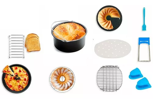Accesorios para freidora de aire, bandeja para hornear bandeja para pizza,molde para cupckaes,rejillas,moldes para cucpcake, adecuada para la mayoría de las freidoras de aire Incluyendo: 13 piezas de accesorios @@para freidora de aire, hechos de metal de alta calidad y Materiales de silicona, son accesorios ideales para freidora de aire, que incluyen canasta para pasteles, bandeja para pizza, rejilla de vapor de una sola capa, parrilla de doble capa, almohadilla de aislamiento térmico, cepillo de aceite, moldes para tartas de 7 orificios. . @@Excelente calidad: está hecho de acero al carbono de alta calidad y materiales de silicona, y está hecho de acero inoxidable de alta calidad. Es duradero, antiadherente y resistente al calor. ¡Todas las herramientas de la freidora se pueden limpiar en el lavavajillas, exquisitas y duraderas! @@Esencial: a medida que más y más personas buscan un estilo de vida más saludable, la freidora de aire se está convirtiendo en la primera opción de muchas personas, por lo que este kit de accesorios para freidora de aire es una herramienta esencial para cocinar. @@Propósito: la almohadilla de silicona protege su precioso escritorio. @La rejilla para pan es adecuada para colocar rebanadas de pan y hornear.