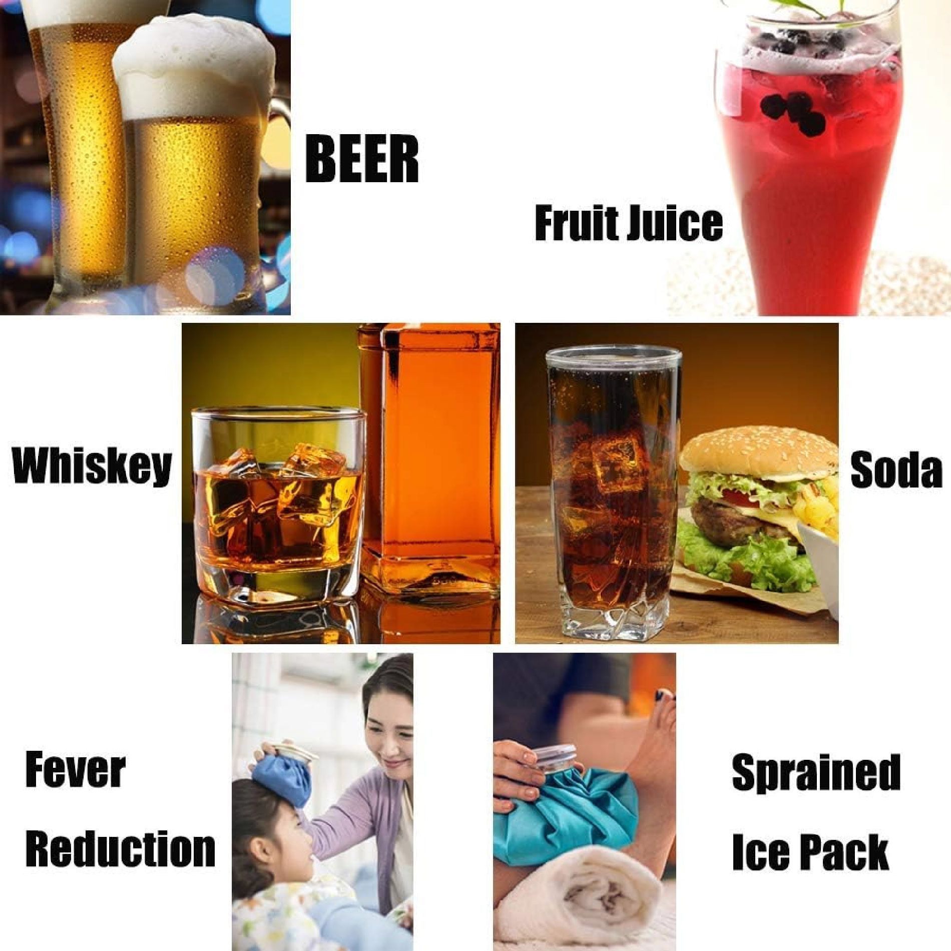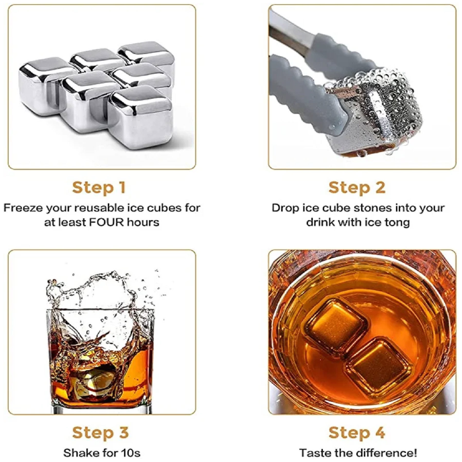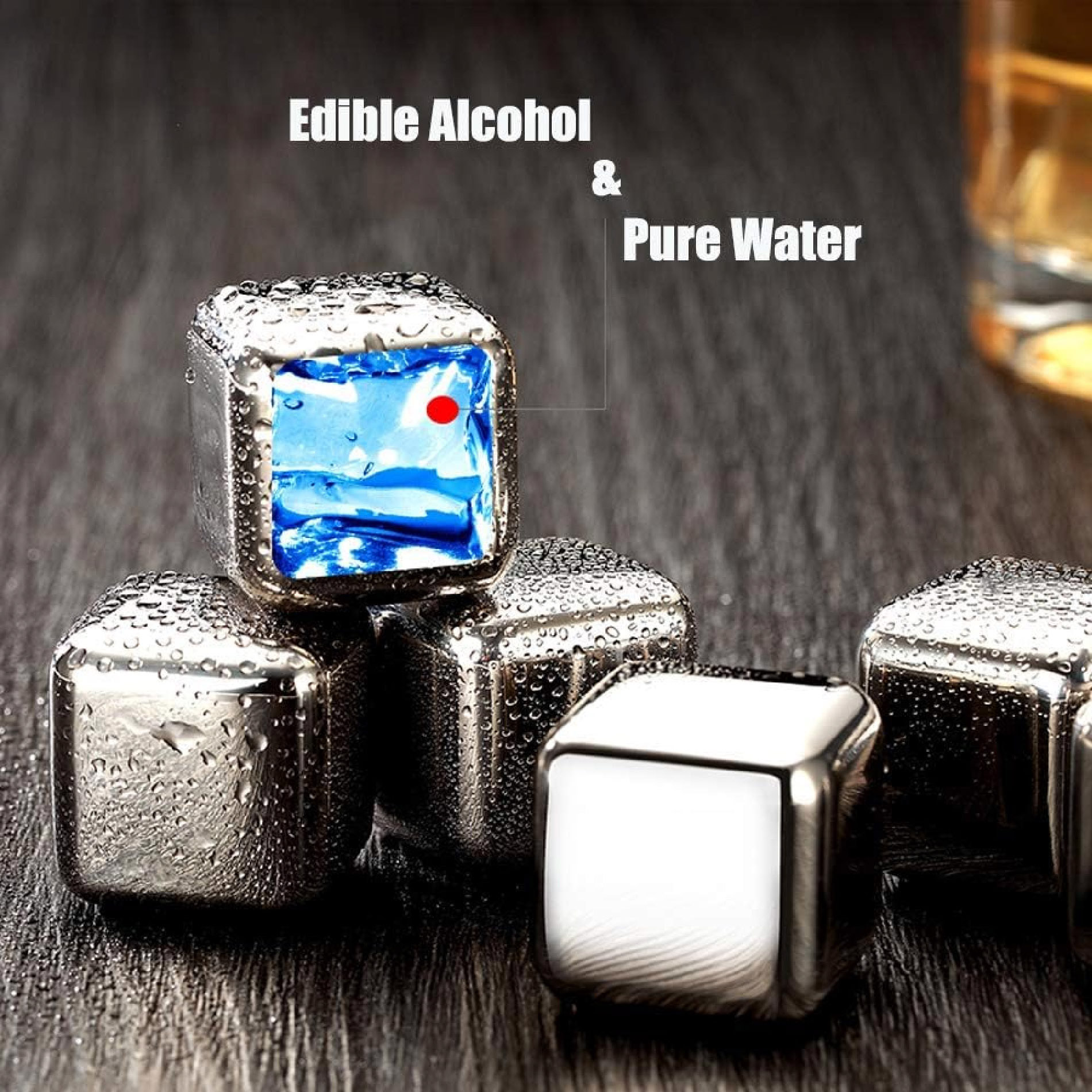 Salud e higiene: El hielo ordinario requiere una alta calidad de agua y puede llevar problemas peligrosos en el proceso de congelación. Mientras que las rocas de whisky están hechas de acero inoxidable de calidad alimentaria Premium, que son más duraderas e higiénicas que los hielos normales. Además, es fácil limpiar y enfriar los cubos después de cada uso y almacenarlos en el refrigerador hasta la próxima vez.
