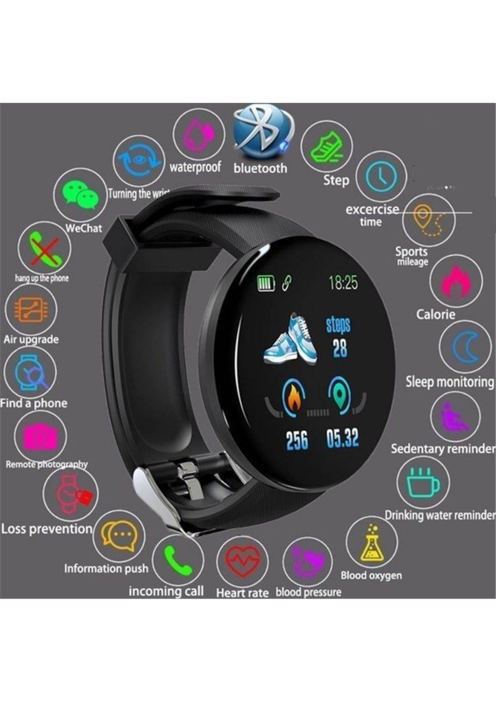 • Monitor de presión arterial:Mantenga un registro de sus niveles de presión arterial con la función de monitoreo de presión arterial de este smartwatch.