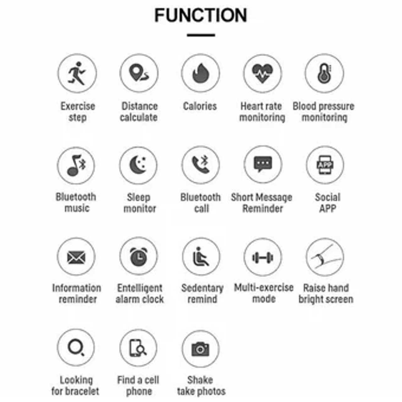 Instrucción las 24 horas, Reloj despertador, Calendario, Cuenta regresiva, Rastreador de actividad física, Rastreador de frecuencia cardíaca, Música interactiva, MES, Recordatorio de mensajes, Pasómetro, Control remoto, Rastreador de sueño, Segundo pequeño, TERMÓMETRO, HORA MUNDIAL , Medición de velocidad