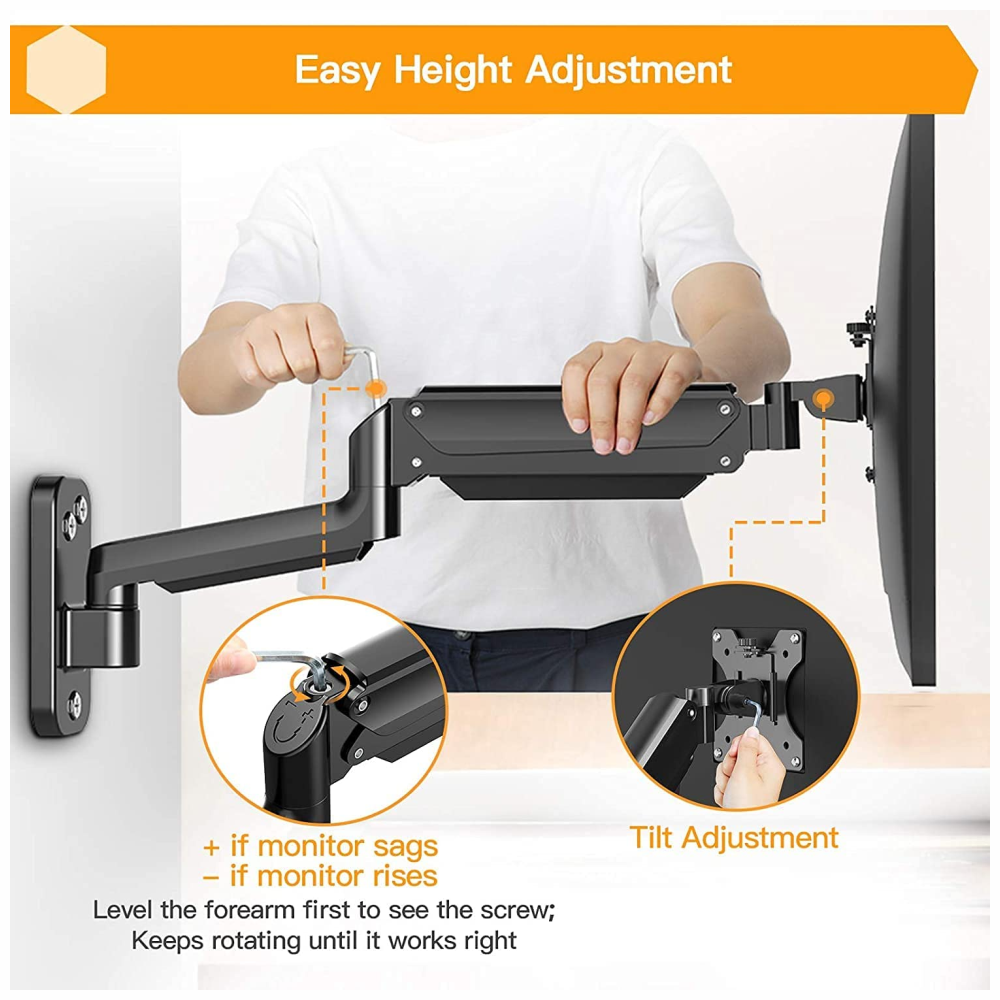 Soporte de monitor articulado de movimiento completo: este brazo de pared para monitor admite una inclinación hacia arriba y hacia abajo de ±45°, un giro de izquierda a derecha de 180° y una rotación de 360°. Brindarle un ángulo de visión más cómodo, ayudar a reducir el dolor de cuello, hombros y espalda, trabajar de manera más eficiente.