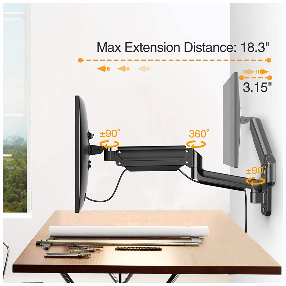 Ahorre espacio: en comparación con el monitor sujeto al escritorio, el soporte montado en la pared puede ahorrar un espacio valioso en el escritorio. No necesita preocuparse de que el soporte esté cerca de la pared y no se pueda extender. Al mismo tiempo, es más estable y permanecerá quieto mientras escribe.