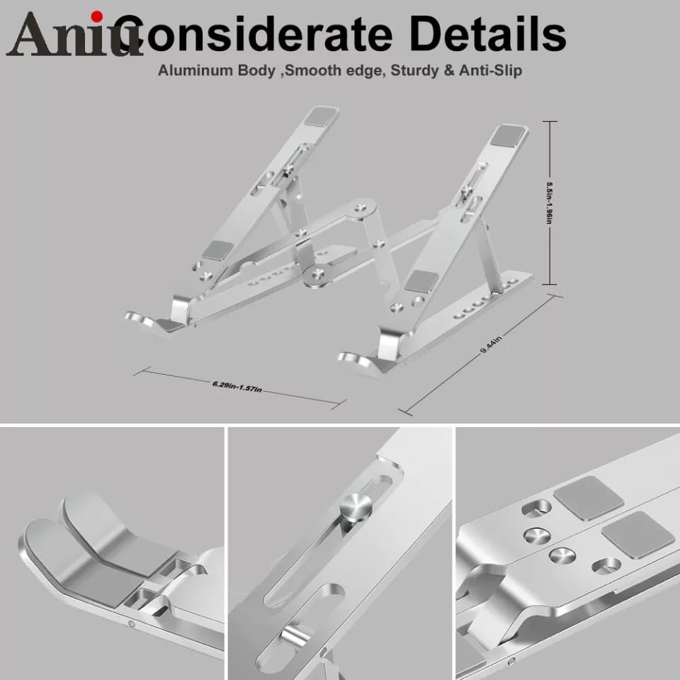 4. Doble protección: la parte superior e inferior del soporte para portátil están equipadas con almohadillas antideslizantes que fijan bien tu ordenador y evitan se raye. Además, los bordes lisos no rayan tus manos.