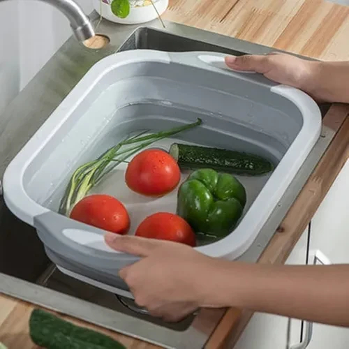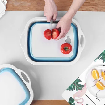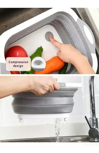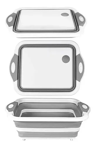 Tabla de cortar plegable portátil con colador – multifuncional de plástico para cocina, plato de silicona, para lavar frutas y verduras @Multifunción 3 en 1: tabla de cortar plegable, colador plegable, cesta de drenaje para lavado de verduras, cesta de almacenamiento. Todo en uno, se puede utilizar para lavar verduras / frutas / platos como un plato plegable, para cortar rebanadas como tabla de cortar, para almacenar bebidas glaseadas y frutas vegetales como cesta de almacenamiento.@Material respetuoso con el medio ambiente: hecho de material de polipropileno de calidad alimentaria premium + TPR, duradero, no se deforma fácilmente. Apto para lavar platos para una fácil limpieza, hecho de plástico TPR sin BPA, sin olor, no tóxico, antideslizante, no se agrieta ni se deforma, 30 mm de grosor extra proporcional una mejor durabilidad. @Necesidad para exterior. La tabla de cortar plegable multifunción ofrece gran comodidad y mejora la eficiencia para el trabajo de cocina. Los mangos ergonómicos contorneados para facilitar el movimiento, las características portátiles son adecuadas para viajes, camping, senderismo, barbacoa, perfecto para glaseado de bebidas, lavar platos, cortar verduras y carnes.@Fácil de usar: ahorra espacio y fácil de usar: presiona el centro con la mano y sujeta el marco con otra mano, abre la tina del plato y empieza a lavar y drenar con el tapón de inserción. Los soportes antideslizantes especiales se pueden colocar en cualquier lugar incluso en superficies lisas. Plegable y luego cortar alimentos en la tabla libremente, el diseño plegable puede ahorrar mucho espacio y fácil de limpiar.