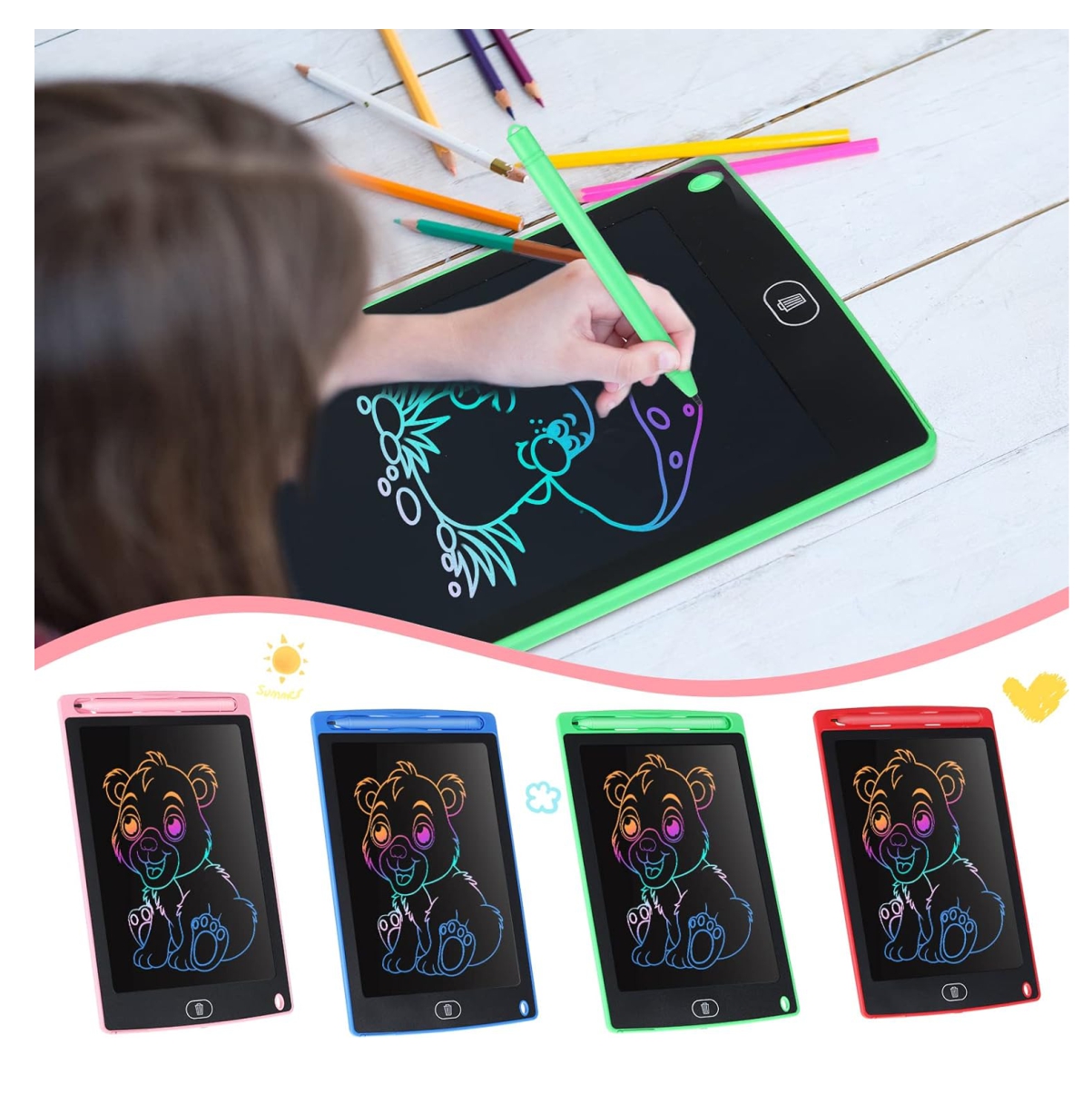 El bloc de dibujo para niños adopta una pantalla LCD a color, diseño impermeable, la escritura a mano solo se puede borrar presionando el botón, y no se borra por error porque es tocada por un niño. Como bloc de dibujo para niños, puede ser tablero de dibujo para niños, pizarra mágica, tableta para niños, tableta de escritura LCD, almohadilla de dibujo para niños.