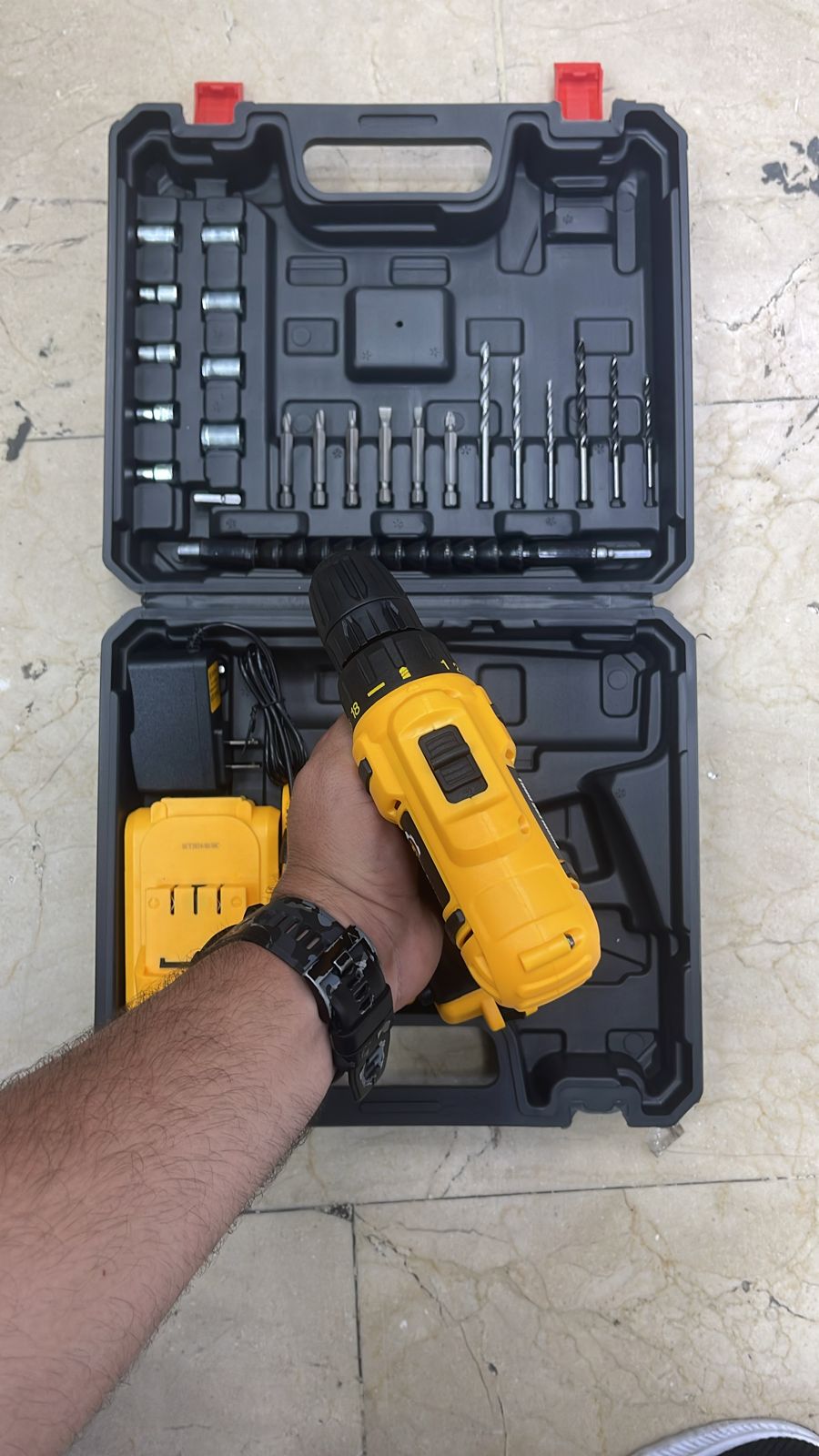 Con un mandril de 10 mm y una velocidad de rotación que varía entre 350 y 1250 rpm, este taladro ofrece la precisión y potencia necesarias para diferentes tareas de bricolaje o profesionales. El kit incluye dos baterías de 2 Ah y un práctico maletín de transporte, junto con 27 piezas adicionales que incluyen brocas, copas y puntas, proporcionando todo lo necesario para comenzar a trabajar de inmediato. Su color amarillo llamativo no solo le da un aspecto distintivo, sino que también facilita su localización en el lugar de trabajo.