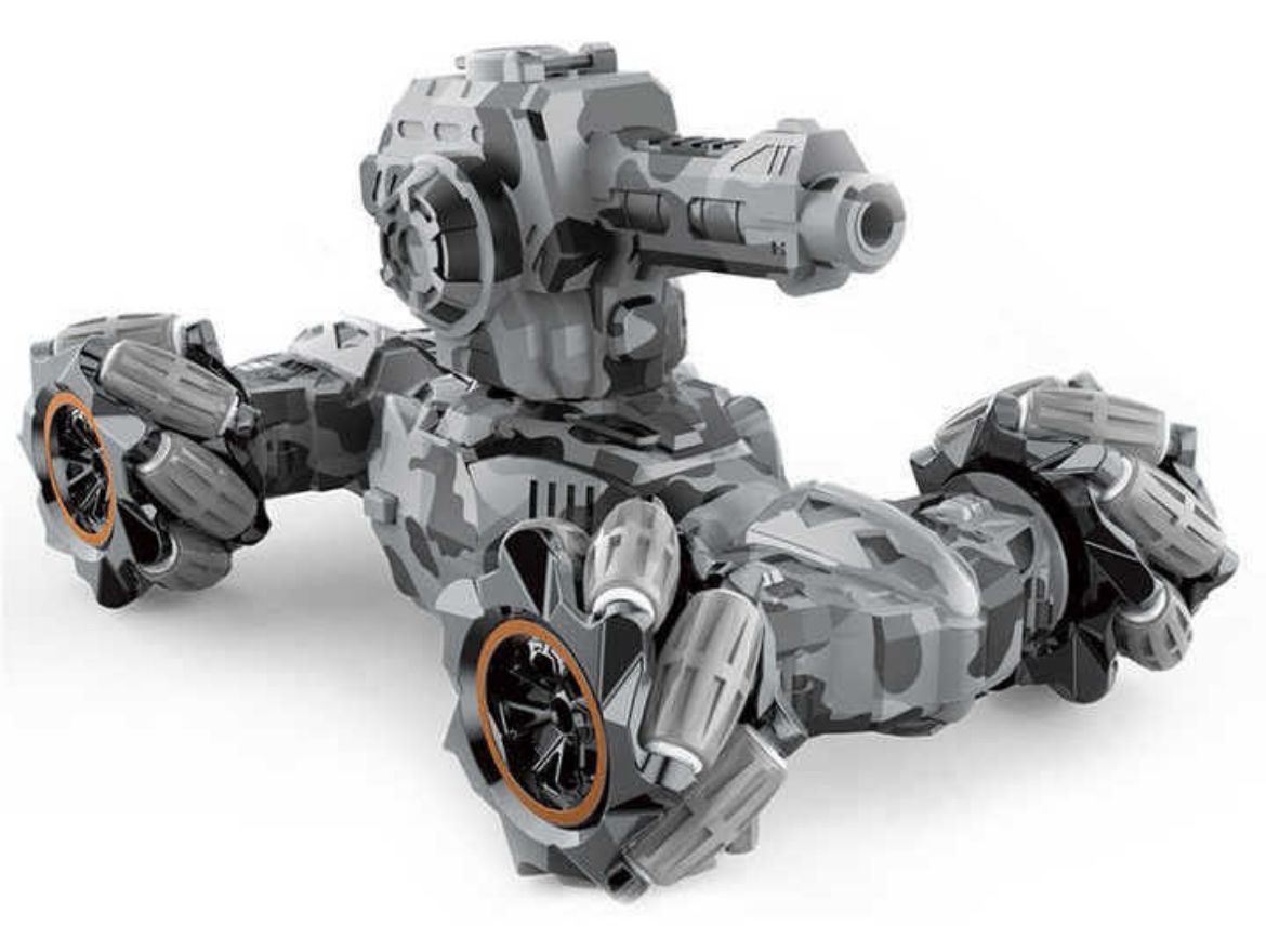 El auto tanque a control remoto está equipado con 4 neumáticos mecanum de estructura mejorada, lo apoya libremente para moverse, deriva, girar en cualquier dirección, incluyendo la deriva izquierda/derecha/diagonal y movimiento lateral, rotación de 360°, etc. Además, el cabezal flexible de la torreta se puede controlar con rotación de 180°, lo que hace que sea muy fácil apuntar al objetivo, lo que te ofrece una fantástica experiencia de batalla. Con cañón que Dispara bolas de hidrogel y doble manejo (Control y reloj)