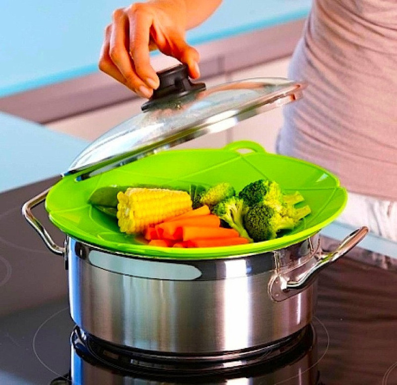 -Cubierta de silicona a prueba de calor se encuentra sobre una cacerola o olla de stock y ayuda a mantener los líquidos hirviendo en la olla, en lugar de en su estufa