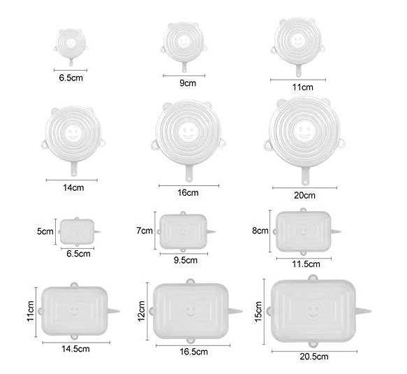 • Múltiples Tamaños Multifunción: Los recipientes pueden cubrirse en varias formas y tamaños, que incluyen: ensaladeras, vidrio, vidrio, comida, lata, latas, tazas, tapones de zumo, ollas, sartenes, sandía, piña, melón u otras frutas y verduras.