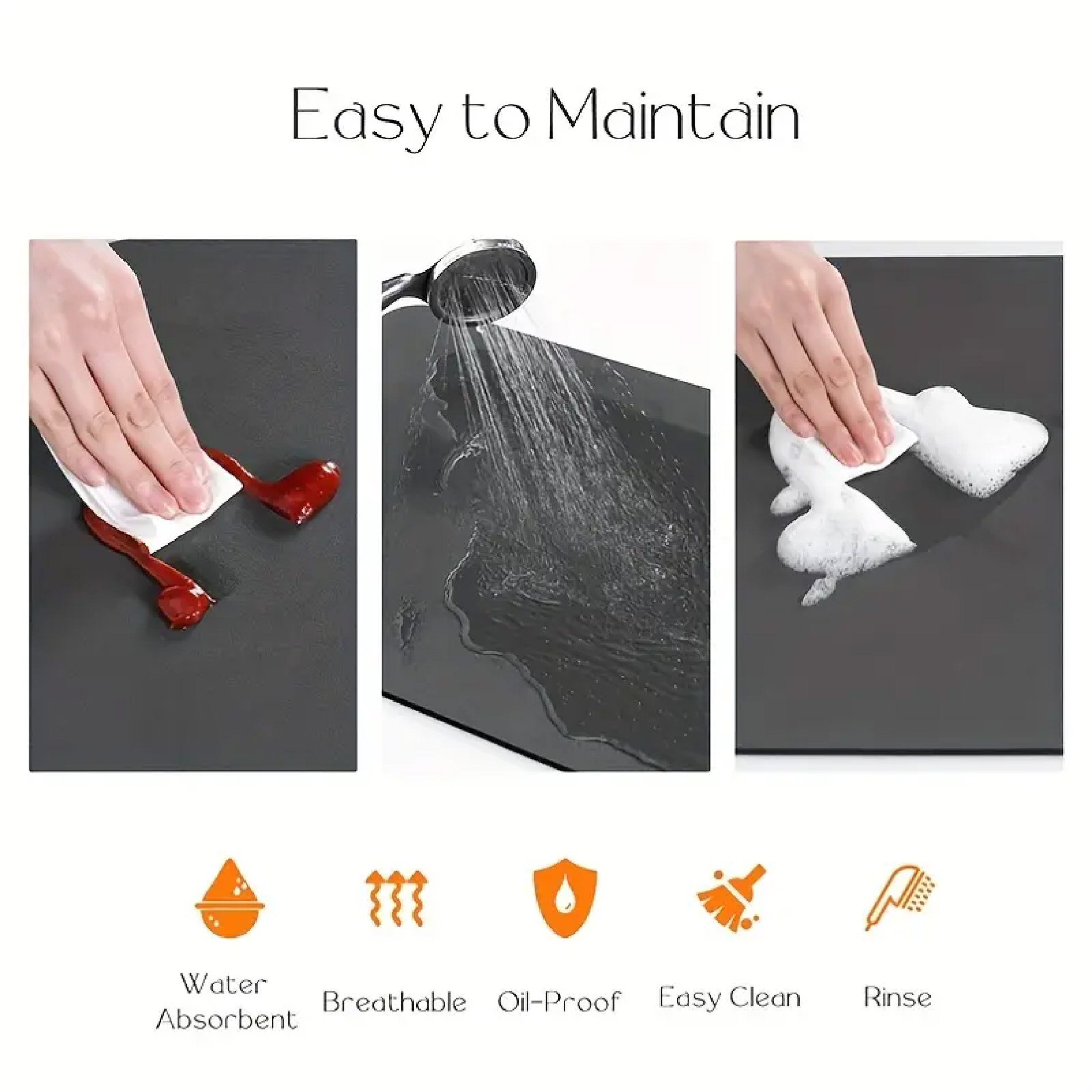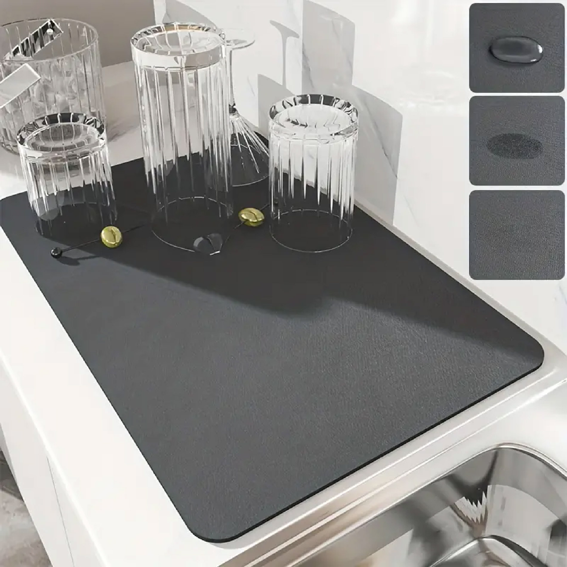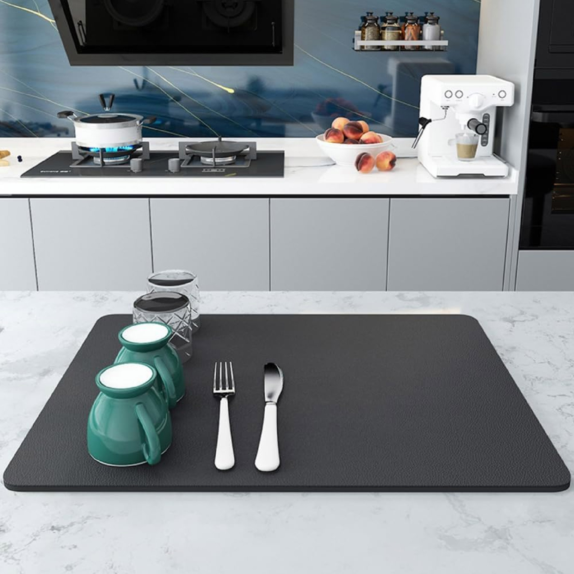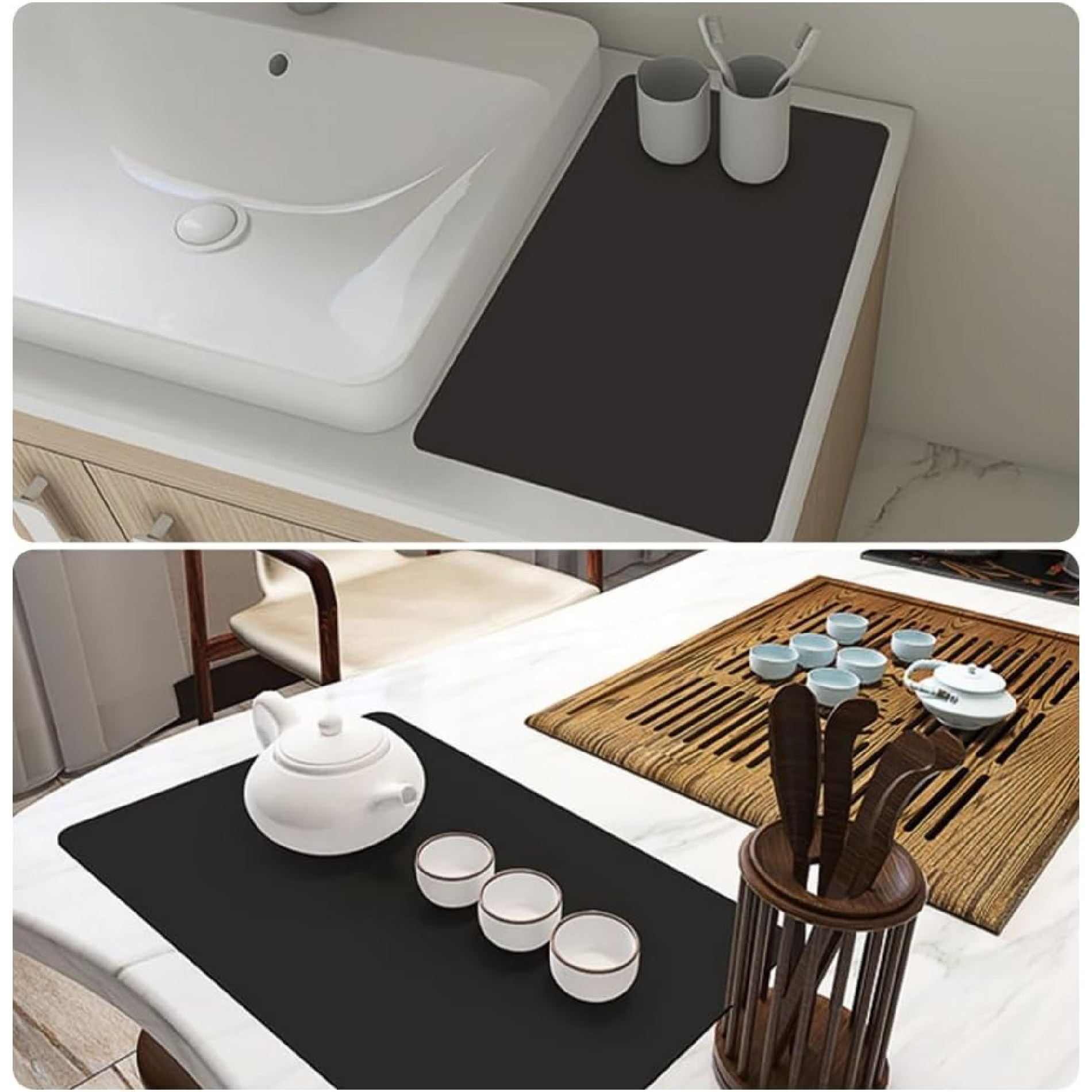 Material: esta alfombrilla para fregadero de cocina está hecha de poliester y goma. Súper absorbente, de secado rápido, antideslizante. Perfecta alfombrilla absorbente para platos.