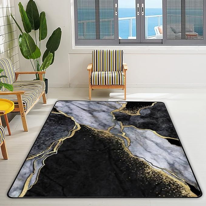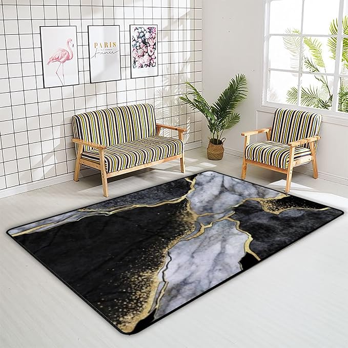 Alfombras de área para sala de estar, mosaico de mármol blanco y negro, venas doradas, antideslizante, alfombra de interior ultra suave, alfombra de área para dormitorio de niños, comedor, decoración del hogar, tamaño grande, 80 x 120 pulgadas
