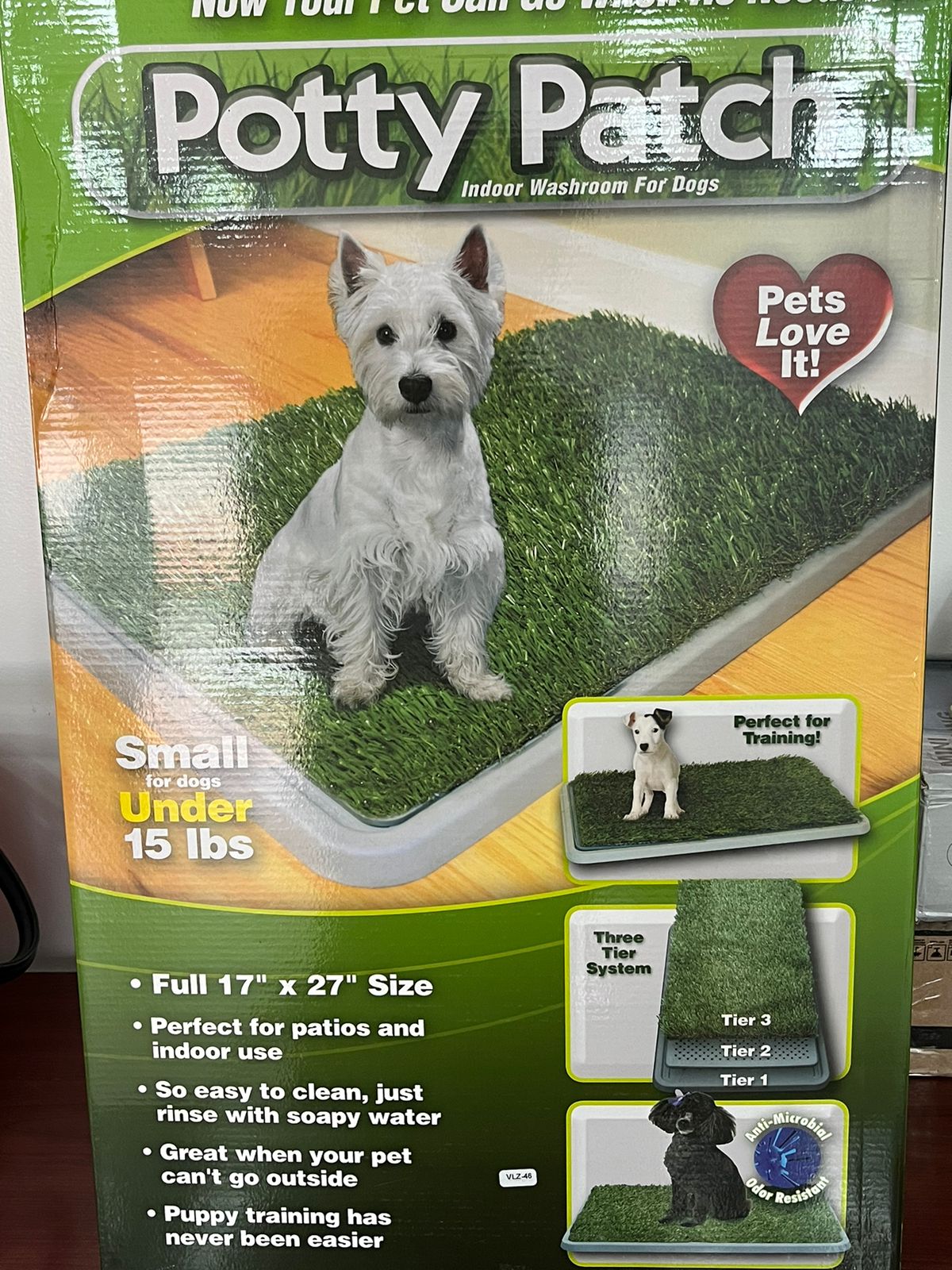 El Potty Patch se compone de 3 niveles, el primero está hecho de un suave césped artificial diseñado específicamente para permitir el flujo de líquido a través del mismo un segundo nivel mantiene la hierba seca y libre de cualquier líquido.