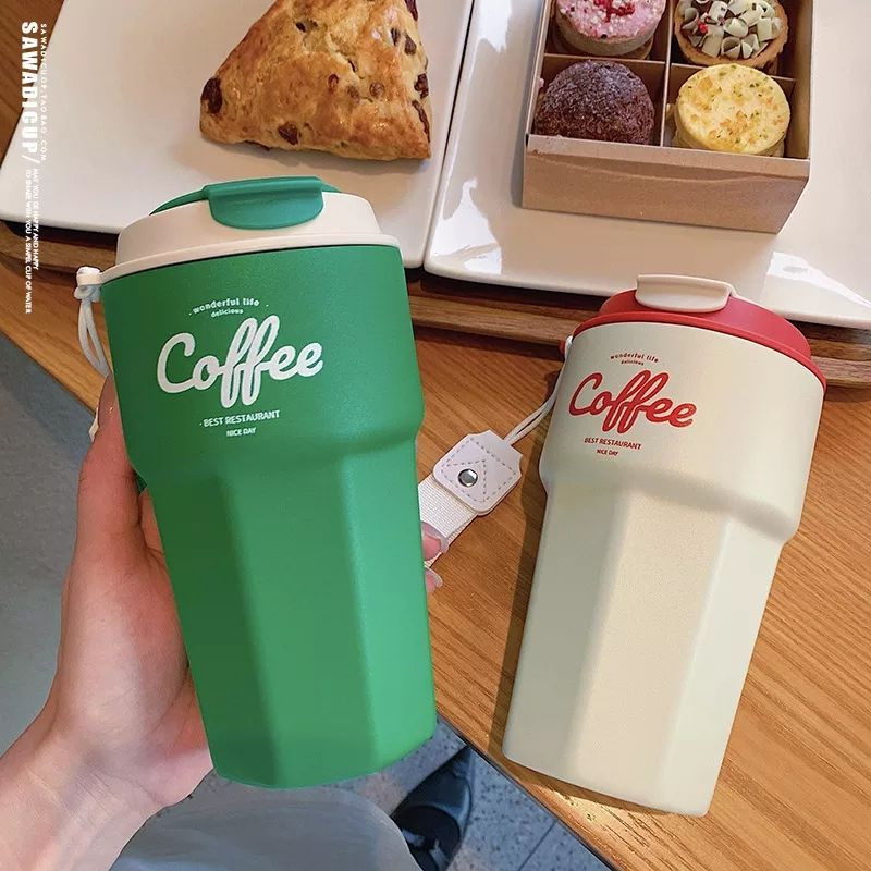 Hermosa taza de café portátil, en acero inoxidable 304 con capacidad de 420 ml, antideslizante, viene con una correa para la taza para una fácil portabilidad.