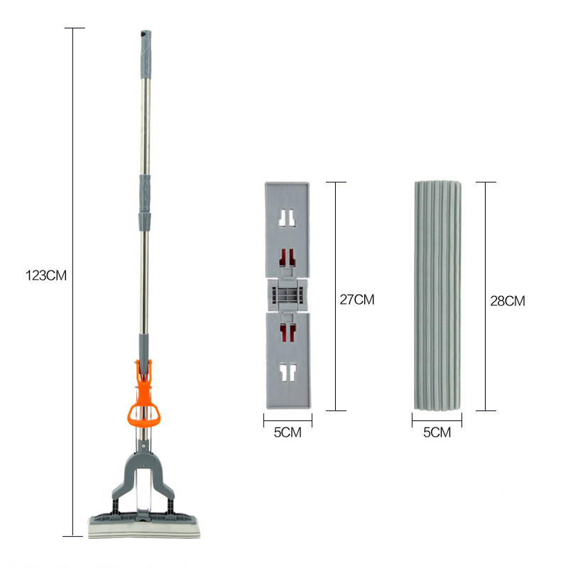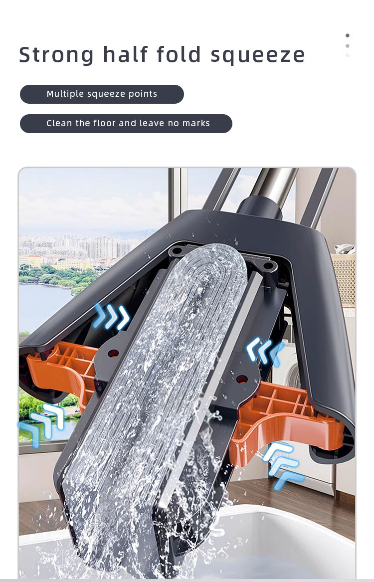 • Una experiencia de limpieza cómoda y sin esfuerzo, la mopa está diseñada para ahorrar trabajo y ser ergonómica. Cuenta con un mango que puede estar con una mano mientras que la otra mano empuja fácilmente la fregona en la barra inferior para escurrirla. Con deslizamiento repetido, el cabezal de la fregona de piso se puede escurrir fácilmente