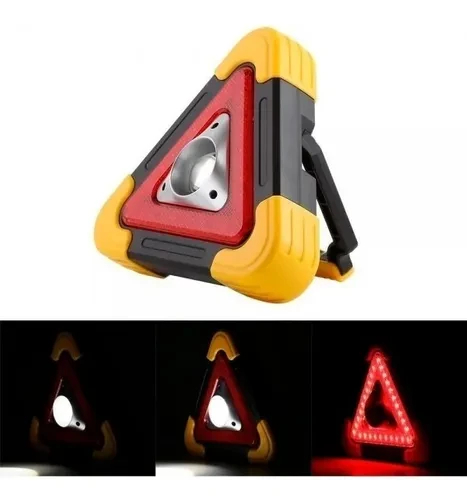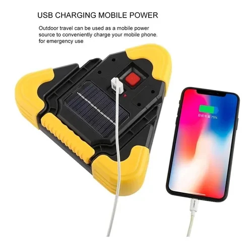 Equipo portátil TRIANGULO + POTENTE FOCO compacto de fácil transporte, con luz led de alto brillo lo que permite que sea visible de mucha distancia. lo puedes cargar mediante energia solar gracias al panel que incluye y también puede ser cargado mediante cable micro usb. (incluido)