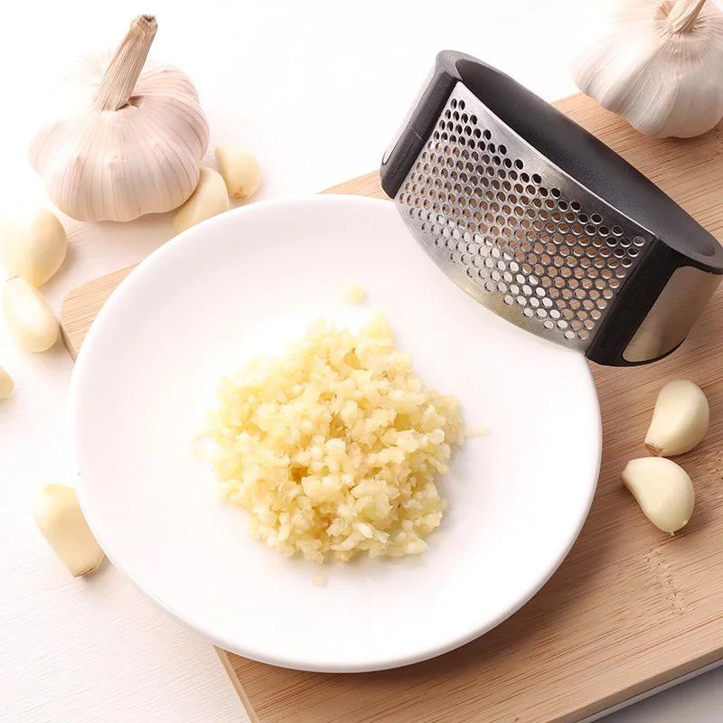 – Es fácil de usar simplemente coloque el ajo limpio debajo y presione hacia adelante y hacia atrás, puedes triturar los dientes con facilidad en cuestión de segundos. . (Se recomienda aplicar un poco de aceite sobre la rejilla para que el ajo no se adhiera)