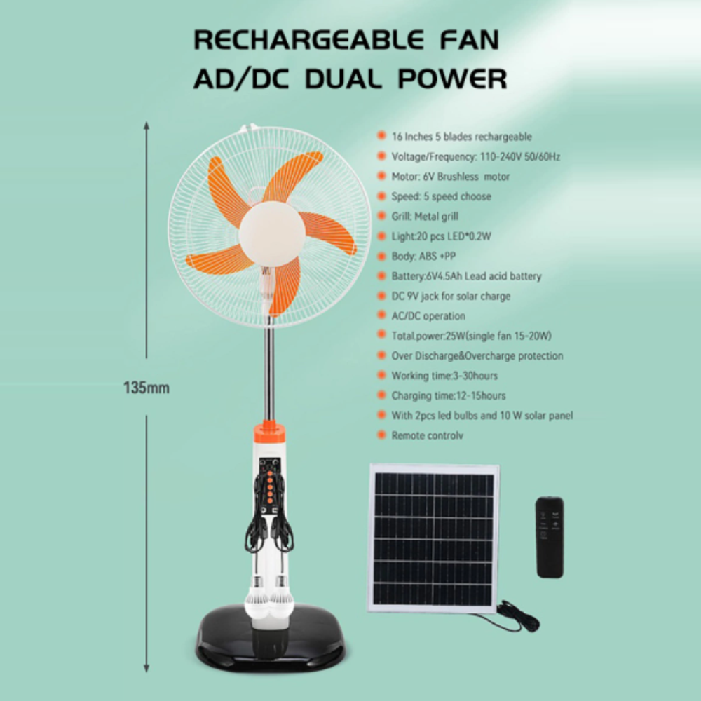 VENTILADOR DE PISO RECARGABLE CON PANEL SOLAR 12V, 5 VELOCIDADES + 2 BOMBILLOS LED + CONTROL REMOTO