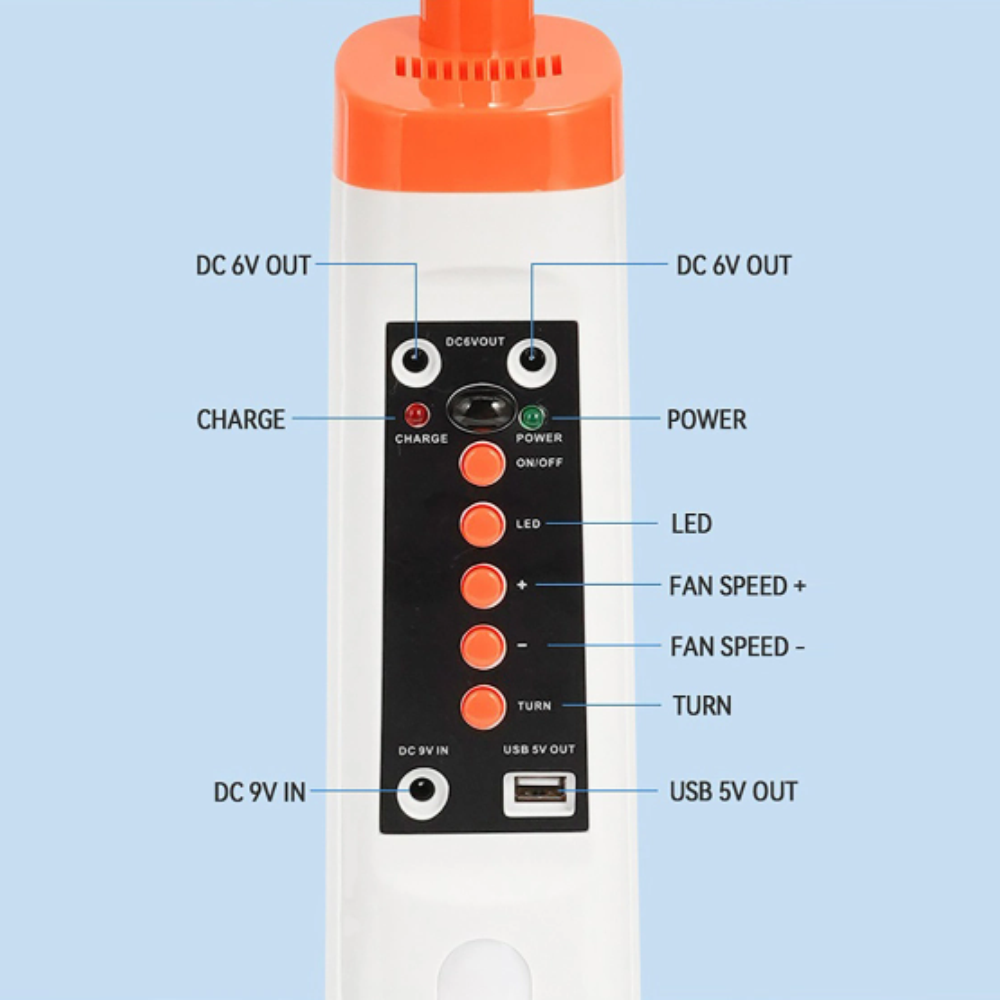2 modos de Carga: Permite recargar el ventilador mediante una fuente de alimentación a 110V o por medio del panel solar. Incluye cable de carga.