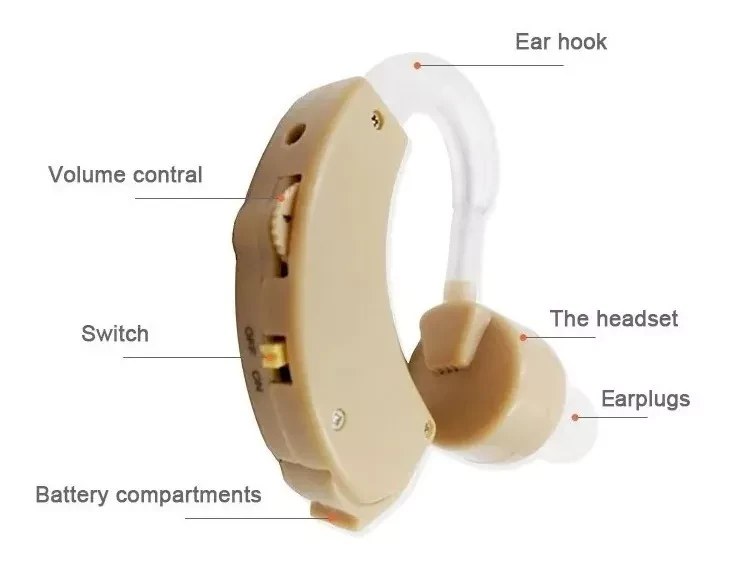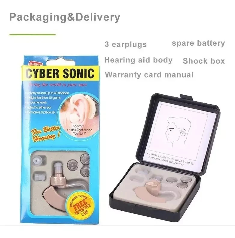 Especificaciones: @@MaxSound salida: 130 +o- 5 dB @@MaxSound ganancia: 55 +o- 5 dB @@Distorsión de onda armónica: menor 10%(1000Hz) @@Rango de frecuencia: 300-4500Hz @@Ruido de entrada: menor 30 dB @@Voltaje de trabajo: dc1 .5V @@Corriente de funcionamiento: menor 3mA @@Color: como se muestra en la imagen @@Tamaño del artículo: 3,8×2,1×0,9x3cm @@Tamaño del paquete : 19×8,2x2cm @@Peso neto: 9g @@Contenido: @1 x audífono @@3 tapones para los oídos (diferentes (tamaño) @@1 x manual del usuario @@1 x caja protectora @@2 x Baterías @@ Nota @@ 1. Ajuste el volumen al mínimo antes de usar.@@2. Elige un auricular de un tamaño ligeramente más grande para evitar el silbato. @@3. Aumenta el volumen gradualmente para evitar un aumento arrepentido del sonido. @@4. Si escucha un aullido, compruebe que la oreja (gel de sílice) es apropiada y si el tamaño del enchufe está apretado, la opción adecuada de tapones para los oídos y enchufado, asegúrese de que no haya fugas de aire. @@5. Mantén el tapón del oído limpio