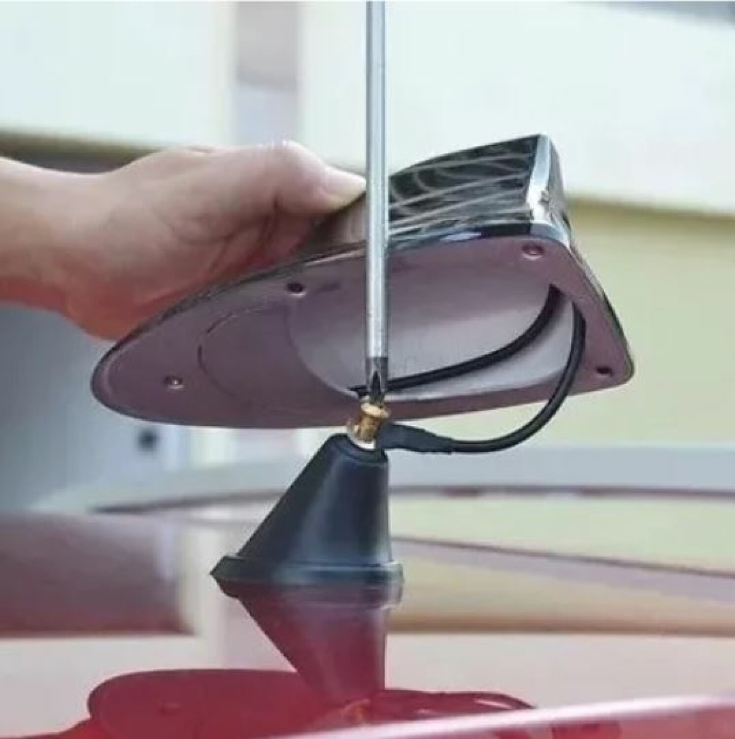 Esta antena con forma de aleta de tiburón viene con un cable de conexión FM/AM en su interior.