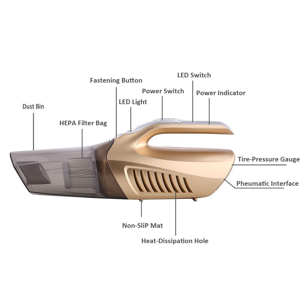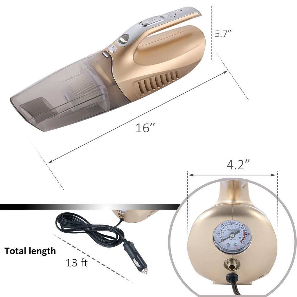 -4 En 1 aspiradora multifunción para coche (aspiradora + bomba infladora de neumáticos + medición de presión + iluminación LED).