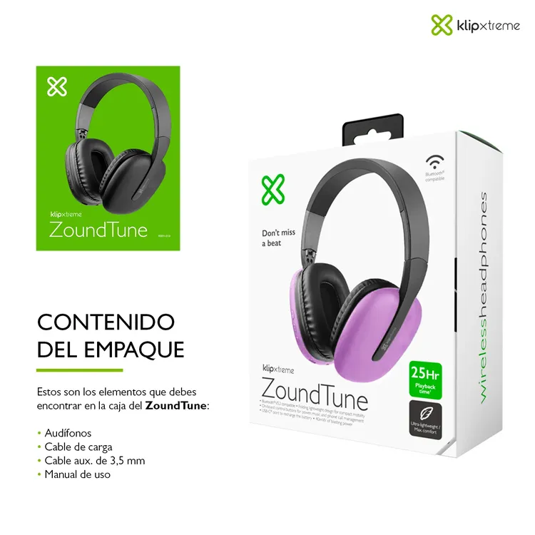 Audífonos – Cable de carga – Cable aux. de 3,5 mm – Manual de uso