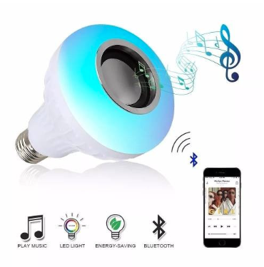 Bombillo led parlante bluetooth, co este dispositivo puedes escuhar musica,apagar o encender la luz con el control remoto y cambiar los diversos colores de luz – @Puede ser controlado vía bluetooth @- Apariencia de la lámpara LED @- Conexión inalámbrica bluetooth @- Base de la lámpara E27 , tipo tornillo @- Volumen ajustable de luz y música. @- Luz brillante, comparable a una bombilla halógena de 50 vatios. @@Especificación: @@- Color de la cáscara: blanco @- Interfaz: E27 @- Voltaje de trabajo: AC100V ~ 240V / Hz @- Potencia: 12W @- Potencia LED: 6W @- Potencia del altavoz: 3W @- Respuesta de frecuencia: 135Hz a 15KHz @- Versión inalámbrica: 3.0@- Configuración de soporte: A2DP @- Gama de radio: 10m (33ft) @- El color de la luz: RGB 16 color con el mando a distancia. @- Amplificador: Clase D @- Entrada de señal: bluetooth. (2. Transmisión Bluetooth 4G) @- Distancia de transmisión de Bluetooth: 5-10 metros @- Contraseña de conexión Bluetooth: no