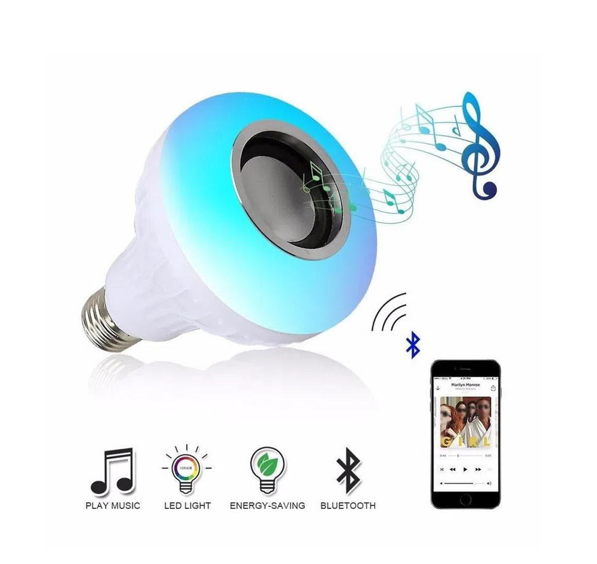 Bombillo led parlante bluetooth, co este dispositivo puedes escuhar musica,apagar o encendre la luz con el control remoto y cambiar los diversos colores de luz