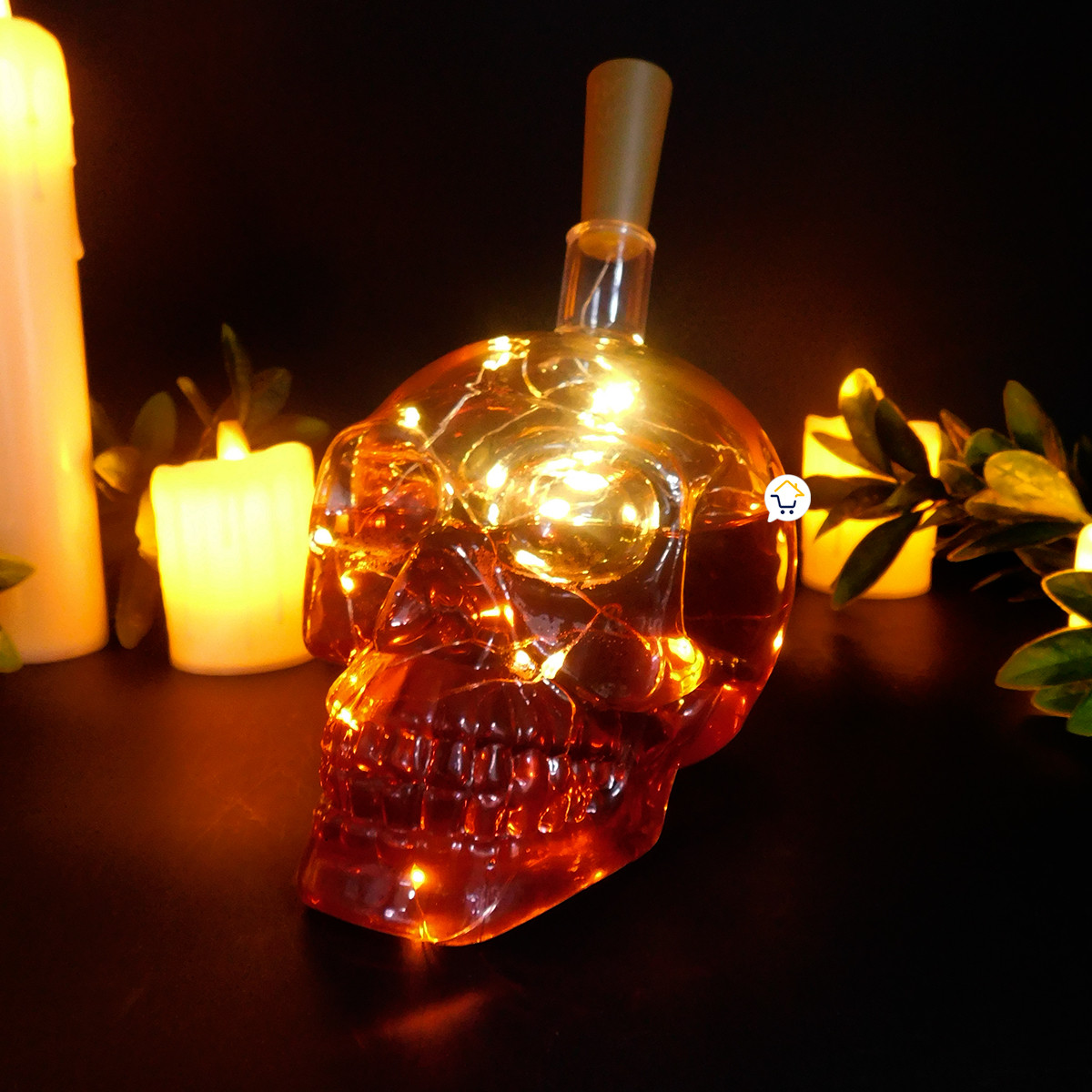 - Si eres de los que siente atracción por los objetos de calaveras, esta botella de cristal de cráneo está hecho especialmente para ti.