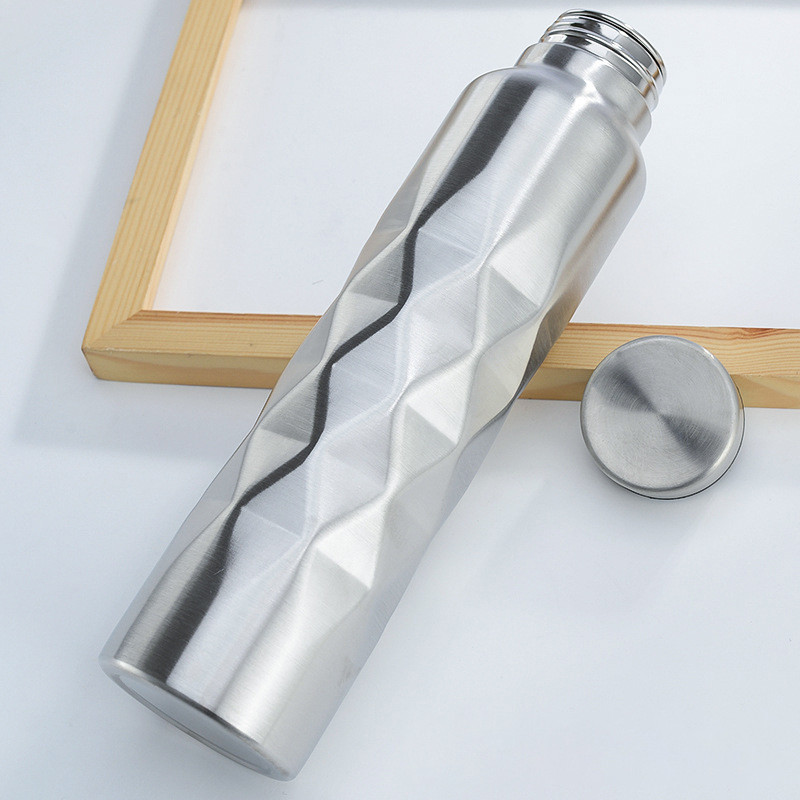 Acero Inoxidable. Tapa rosca interior plástico. No apto para bebidas calientes. Medidas:28.3 cm x 7 cm diámetro.