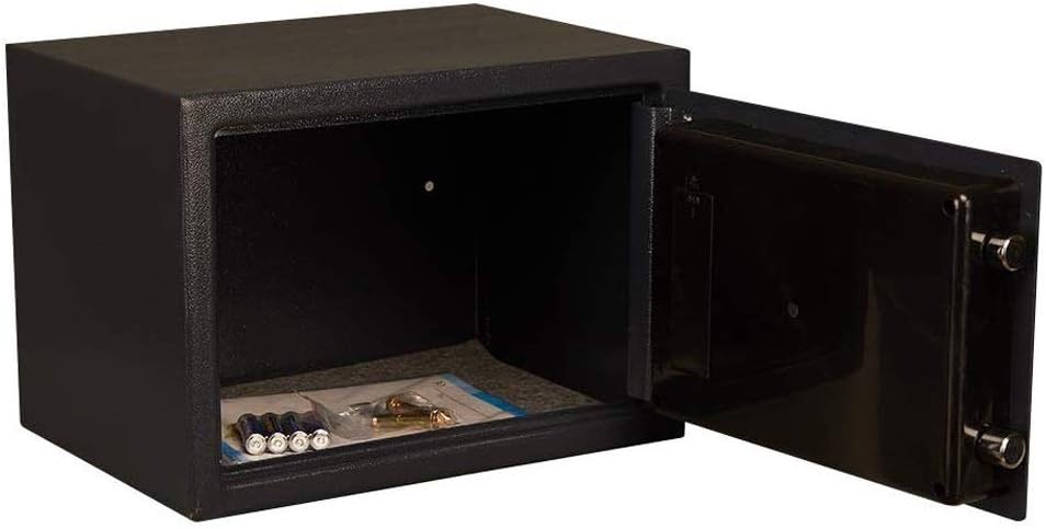 - Fuerte y firme: La caja fuerte está hecha de acero. Los cerrojos de seguridad de la puerta de acero doble y el recubrimiento en polvo anticorrosión y antiincrustante garantizan la seguridad de la caja de seguridad.