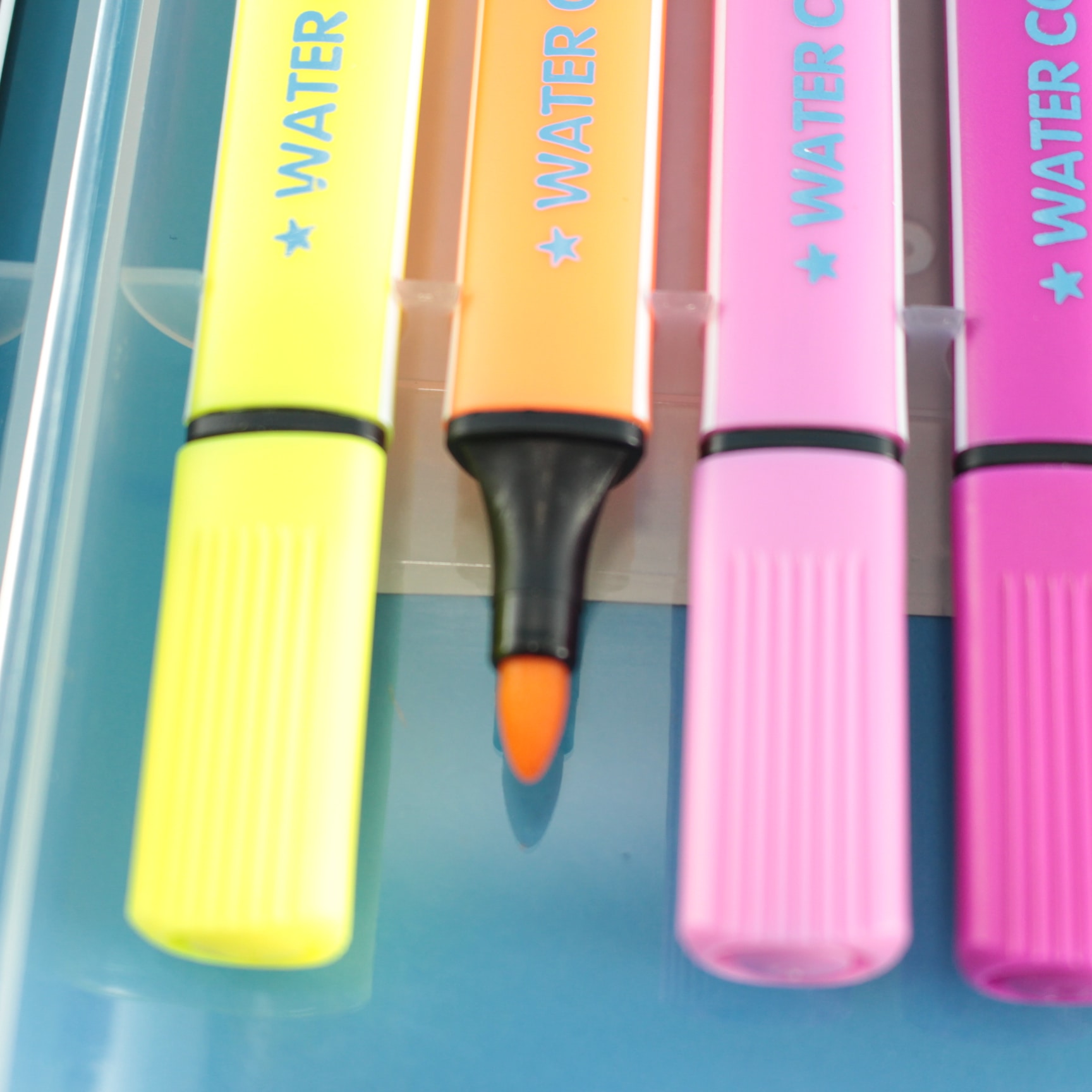 Caja de marcadores x 12 colores diferentes vivos, de punta redonda, plásticos.
