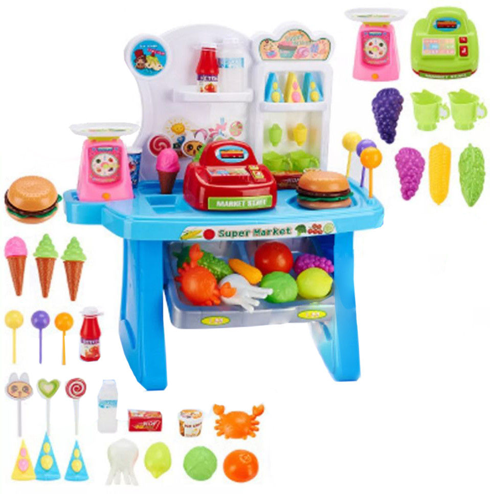 Incluye 30 piezas: varios artículos de comida y bebida de simulación para abastecer los estantes, así como una caja registradora de juego electrónica.