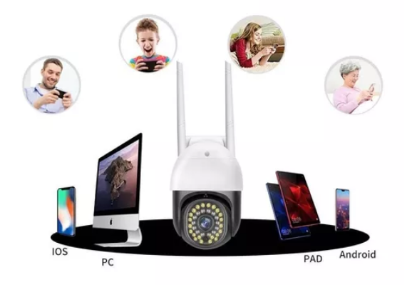Impresionante cámara PTZ de seguridad para exteriores (resiste lluvia y sol) FULL HD P, configuración rápida de wifi a través Smartphone usando la aplicación, tecnología Plug / Play para acceso remoto, control panorámico / basculante y zoom digital 4X inteligente, luces LED ir cut incorporadas para visión nocturna de hasta 30 m, de pie para ver en cualquier espacio, iluminación de luces LED blanca que se activan cuando se detecta la presencia de un cuerpo humano u objeto (Configurable), cuenta con 2 antenas de 5db de señal, permite conexión con cable RJ-45, admite alarma de detección de movimiento, audio bidireccional directamente a tu smartphone, tableta o PC con Windows, ranura para tarjeta SD para grabación local (máx. 128GB) o NVR Onvif, reproducción en línea.
