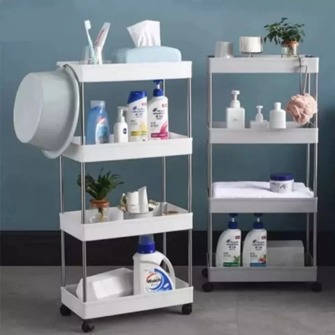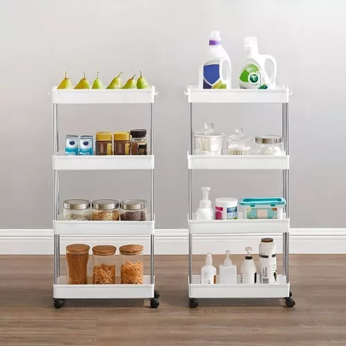 Carrito ELA de 4 niveles: muy fácil de mover, 4 ruedas con freno, 2 ganchos para que cuelgues lo que quieras y espacio para que mantengas tus cosas en orden. Multiuso. Diseño de bandejas con ventilación. Construcción robusta para soportar peso. Material: plástico blanco con barras metálicas.