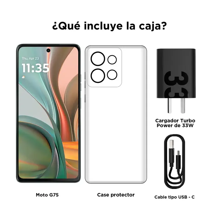 Cargador de 33W, Cover protector, Cable USB tipo C, Manual, Herramienta de Remoción de SIM