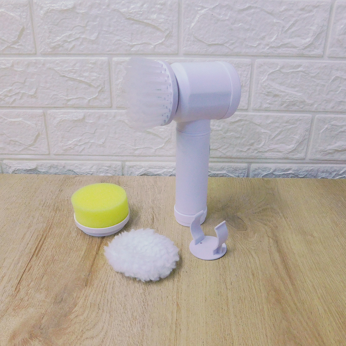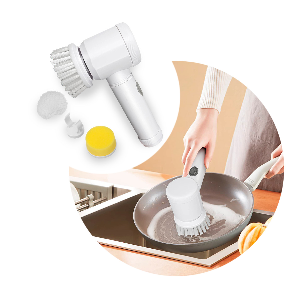 - Con cabezales intercambiables: Cepillo para limpieza profunda, esponja para lavar platos o superficies suaves, almohadilla que pondrás sobre la esponja para pulir superficies.