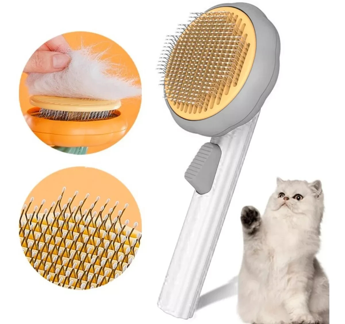 este espectacular Cepillo Masajeador Quita Pelo Pet Brush. Peinar a tu peludo nunca fue tan fácil, con este cepillo innovador puedes peinar a tu mascota y eliminar fácilmente el pelo flotante. Cuenta con un mecanismo que saca el pelo de manera automática al accionar el botón. Está diseñado para llegar a zonas profundas de cabello sin lastimar la piel de la mascota, tiene un diseño ergonómico que lo hace fácil de usar.