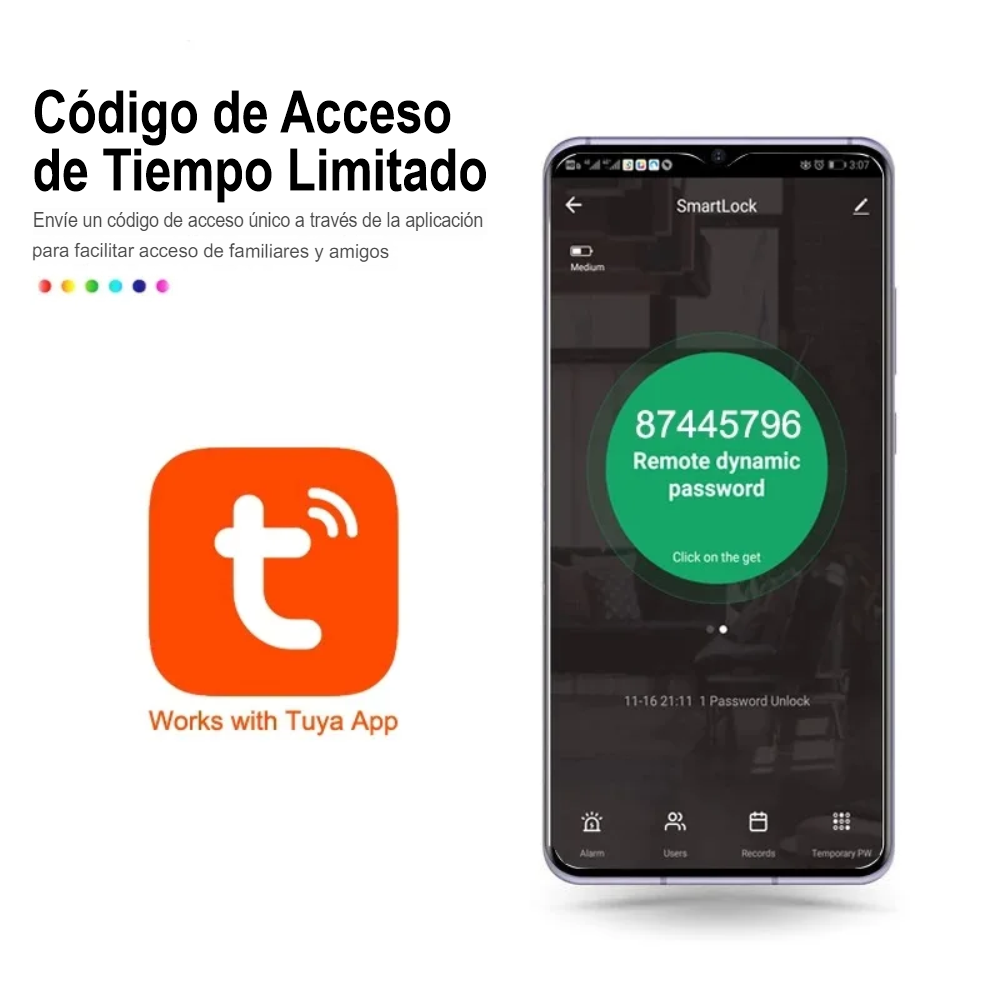 Con cinco métodos de acceso integrados, esta cerradura te ofrece la libertad de elegir cómo ingresar a tu hogar: huella dactilar, contraseña numérica, tarjeta RFID, llave mecánica y control remoto a través de la aplicación Tuya Smart. Ya sea que prefieras la comodidad de desbloquear tu puerta con tu huella dactilar o la facilidad de usar tu teléfono para controlar el acceso, esta cerradura inteligente se adapta a tus necesidades.