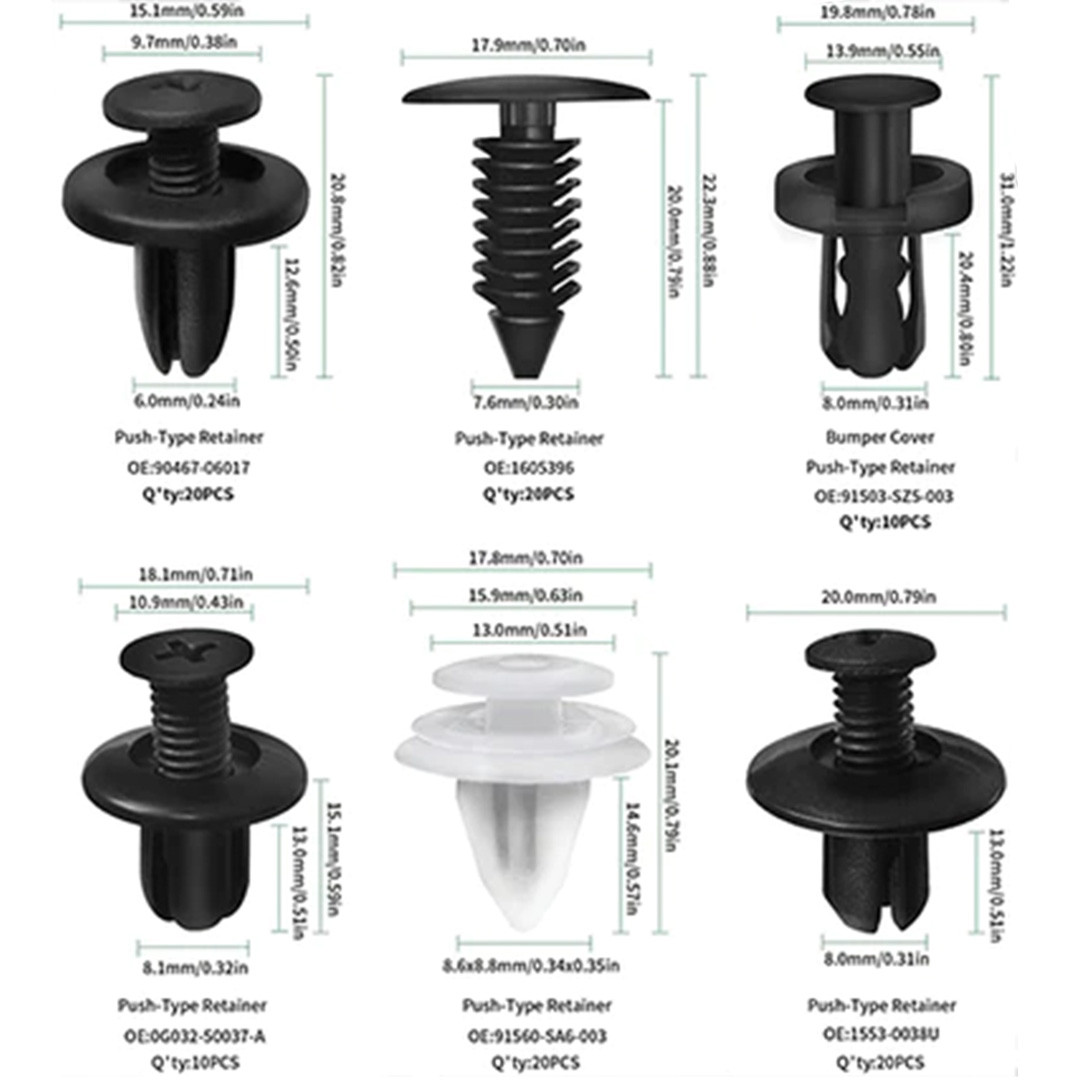 1 juego incluye 6 tipos universales de clips retenedores que funcionan perfectamente con la mayoría de los modelos de automóviles . Ampliamente utilizado para diferentes partes de vehículos, incluidos guardabarros, parachoques, rejilla, cubierta del motor, molduras de puertas , protección del radiador, reemplazo del retenedor de protección contra salpicaduras y más.