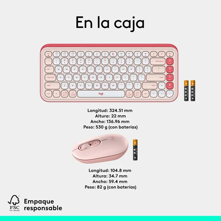 Mouse<br>1 batería AA (preinstalada)<br>Documentación para el usuario<br>Pegatina<br>Teclado<br>2 baterías AAA (preinstaladas)<br>Documentación para el usuario<br>Pegatina