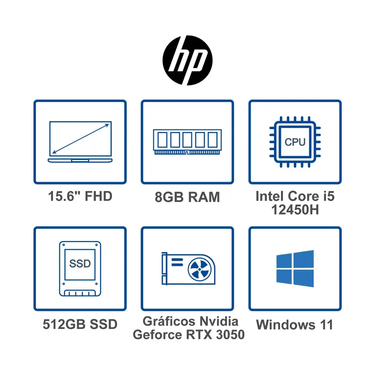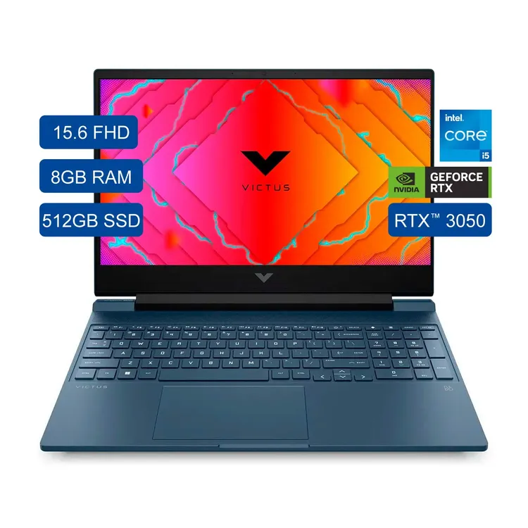 [2=Capacidad de Disco=Estado Solido SSD 512 GB, 1=Procesador=Intel Core I5, 3=Memoria RAM=8 GB, 5=Tarjeta Grafica=GeForce® RTX 3050, 4=Tamaño Pantalla=15.6 Pulgadas]