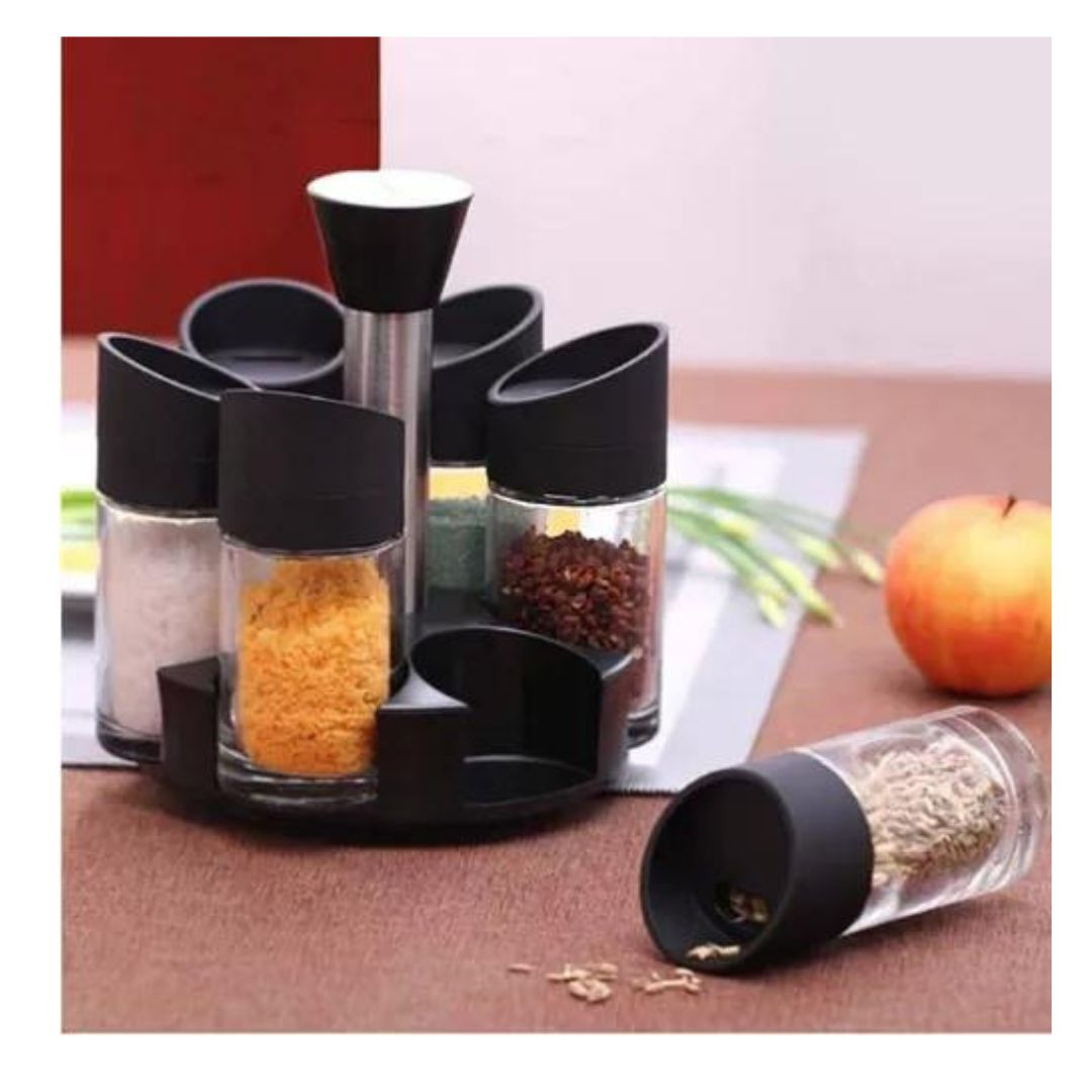 ste organizador de especias le brindará a tu cocina un toque elegante y despejado, sus 6 recipientes de material plástico de alta calidad son de alta durabilidad fáciles de limpiar, además cada uno de ellos cuenta con una tapa giratoria de 3 posiciones para permitir filtrar desde avena en hojuela hasta granos finos de sal u orégano. Su diseño es giratorio de esta manera podrás alcanzar cada frasco sin problema alguno.