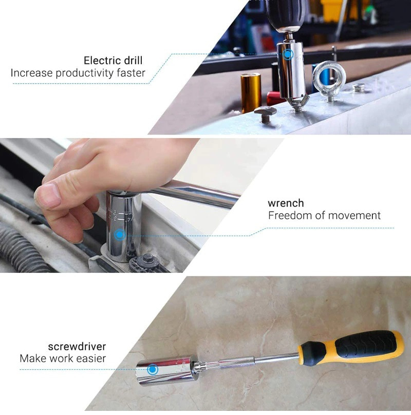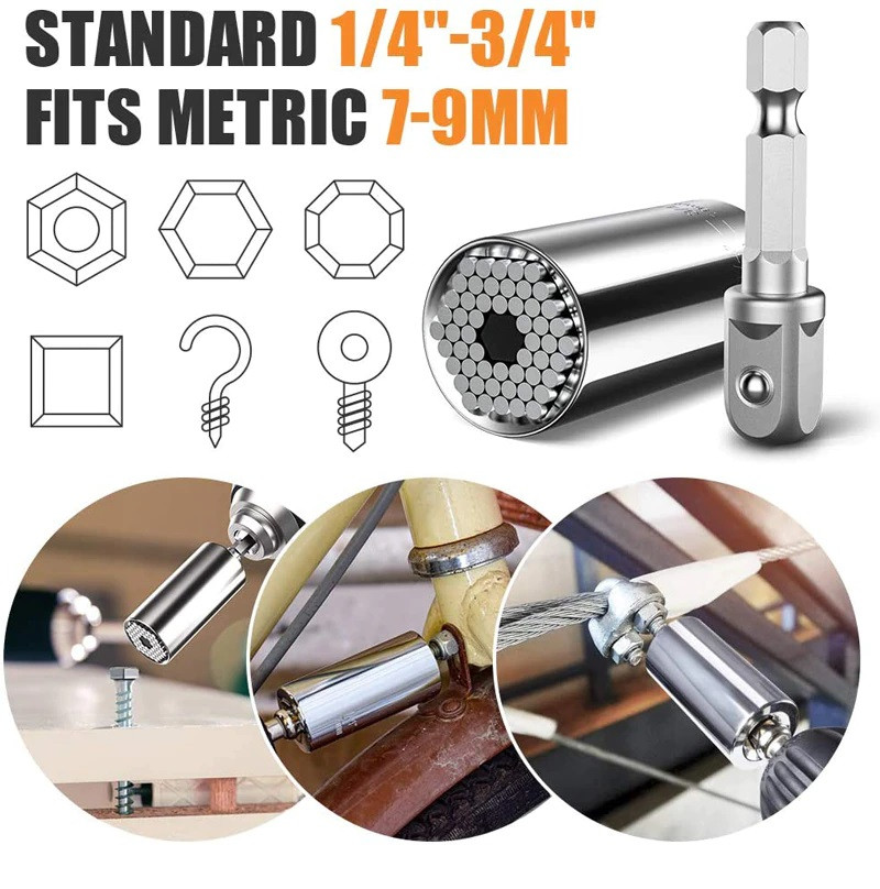 – Copa universal que se ajusta instantáneamente para sujetar tuercas hexagonales, tornillos, ganchos, tornillos tirafondo y cabezas de tornillos. Se adapta a tuercas y pernos estándar de 1 / 4- a 3/4 pulgadas y métricas 7-19 mm.