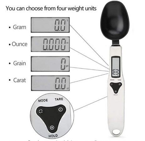 Esta es una báscula electrónica de alta precisión. La precisión tiene una calificación de 0,1g. Proporciona 4 unidades de peso para transformar. Puede medir el peso del condimento, como sal, azúcar, almidón…
