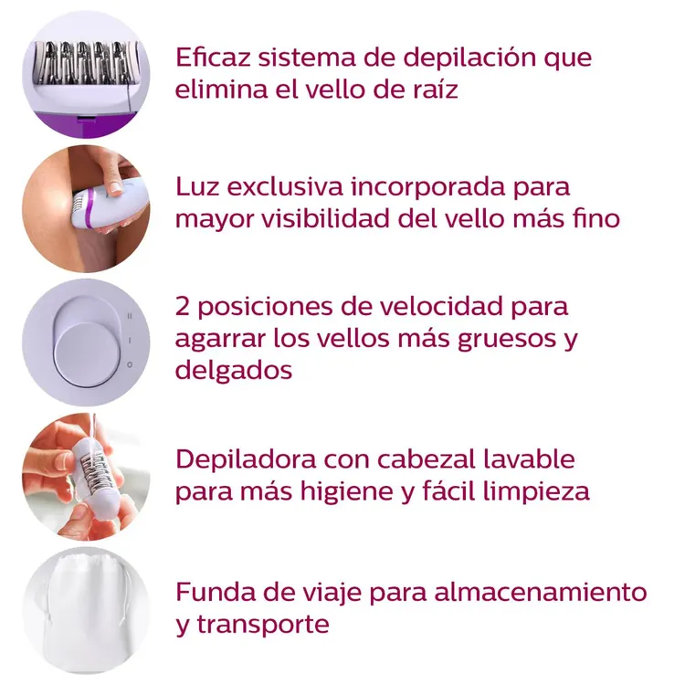 Depiladora con cabezal lavable para más higiene y fácil limpieza. Cabezal de afeitado y peine recortador para un afeitado al ras.