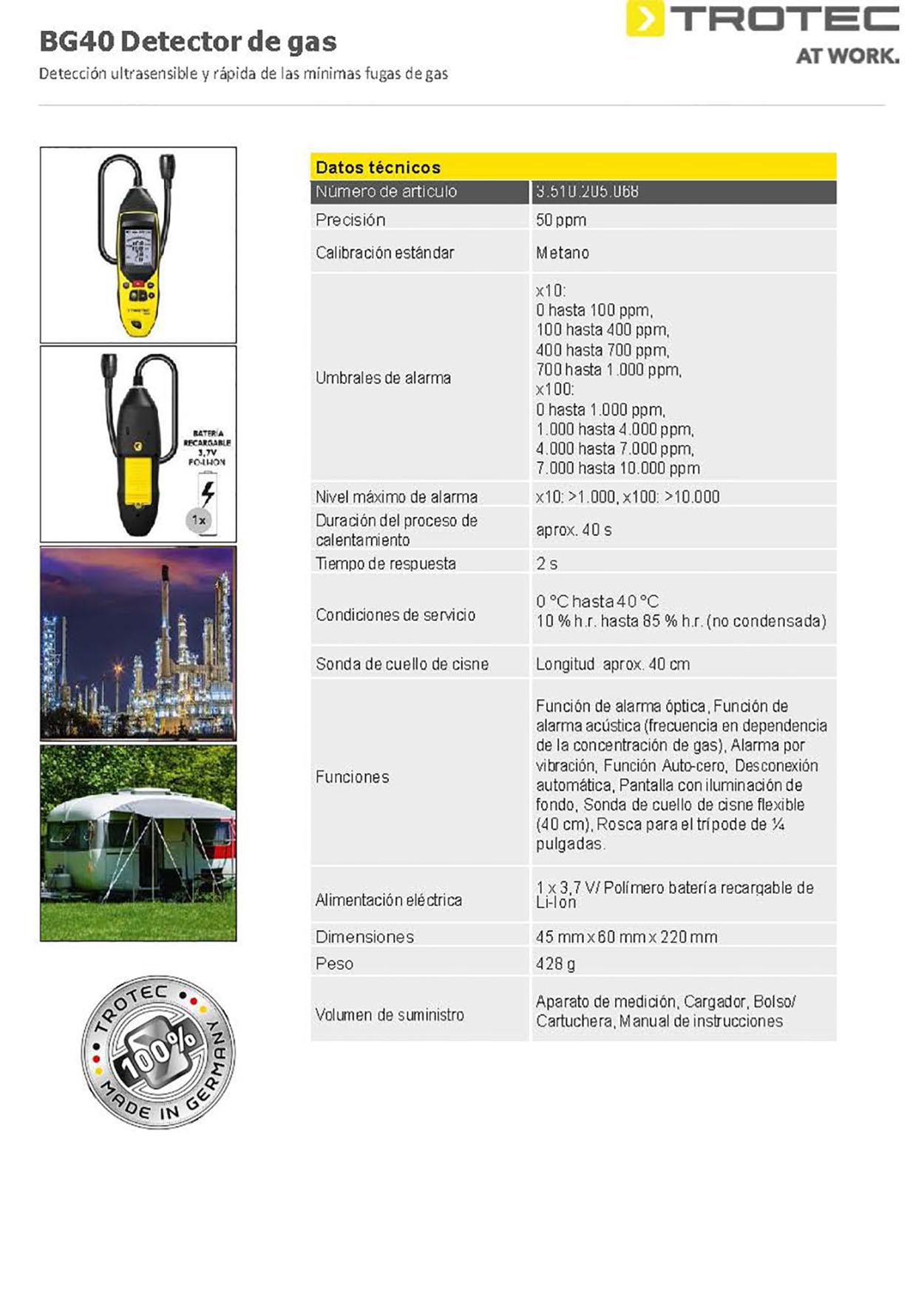 Tanto en el ámbito privado como en el industrial el almacenamiento y el uso de gases inflamables, como por ejemplo el gas natural, el metano, el etanol y el propano, suponen un alto riesgo en el día a día. Por eso, la hermeticidad de las pipetas de gas y los recipientes de gas licuado que se encuentran tanto en viviendas como en embarcaciones, así como de las tuberías de gas y su grifería, debe ser controlada regularmente con un detector de gas como el BG40.