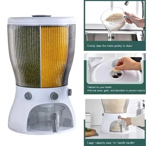 Rotación de 360°: el cubo de arroz se puede girar 360°, lo que es conveniente para verter sin moverse. La cubierta superior se puede quitar, lo que es conveniente para añadir grano y añadir más conveniente.