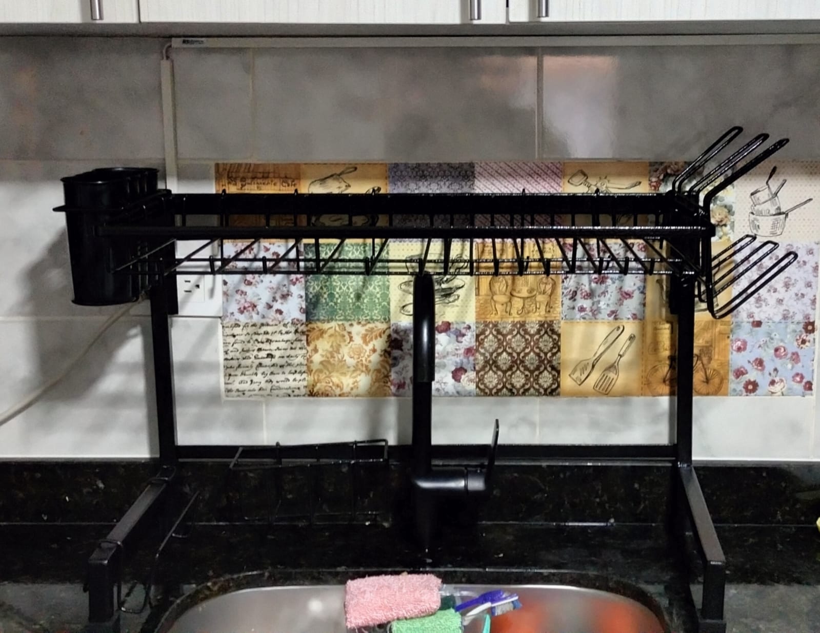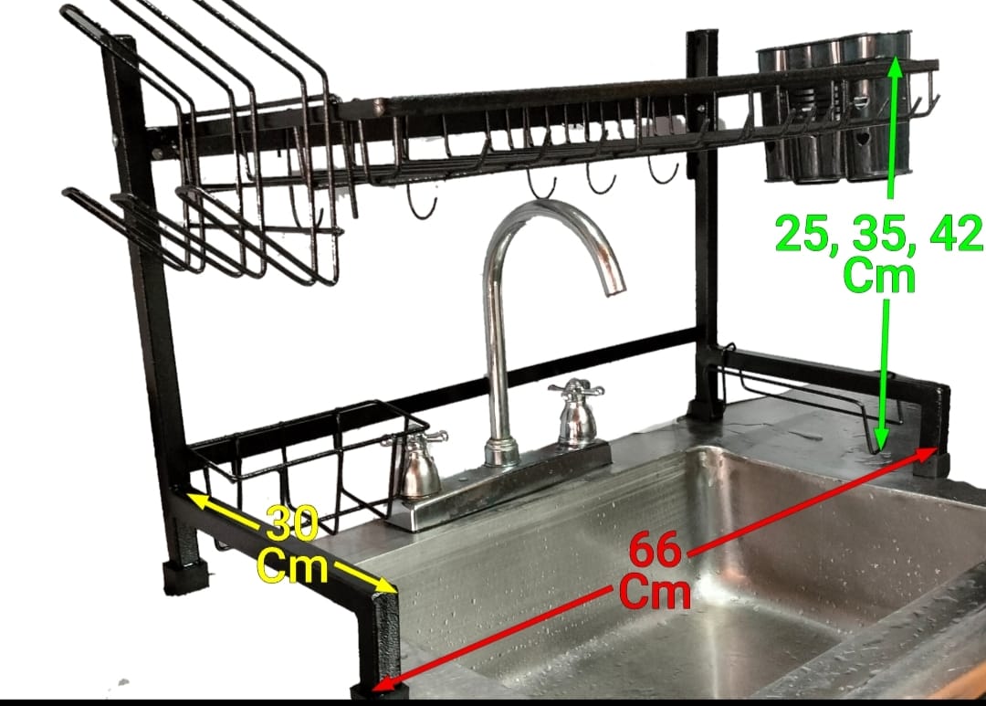Escurridor ahorrador de espacio sobre lavaplatos, grande multiusos, resistente, capacidad para 18 platos, espacio para pocillos, vasos, escurridor de cubiertos. @@Multiusos, gracias a su diseño plano y grande, tiene suficiente espacio, es resistente puedes poner frutas, verduras, ollas. @@Metálico, anticorrosivo, pintura horneada electrostática resistente a la oxidación, escurridor de cubiertos de plástico. @@tres alturas graduables según el espacio o la altura del grifo, 25 cm para grifos hasta de 20 cm de altura, 35 cm para grifos hasta de 30 cm de altura, 42 cm para grifos hasta de 37 cm de altura. @@@Ancho 66 cm @fondo 30 cm @altura graduable de 25, 35, o 42 cm